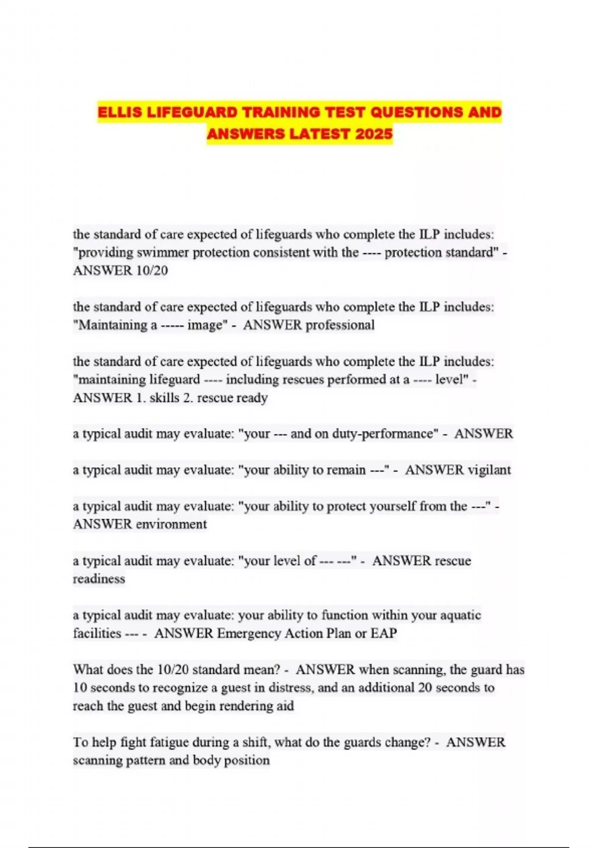 ELLIS LIFEGUARD TRAINING TEST QUESTIONS AND ANSWERS LATEST 2025...