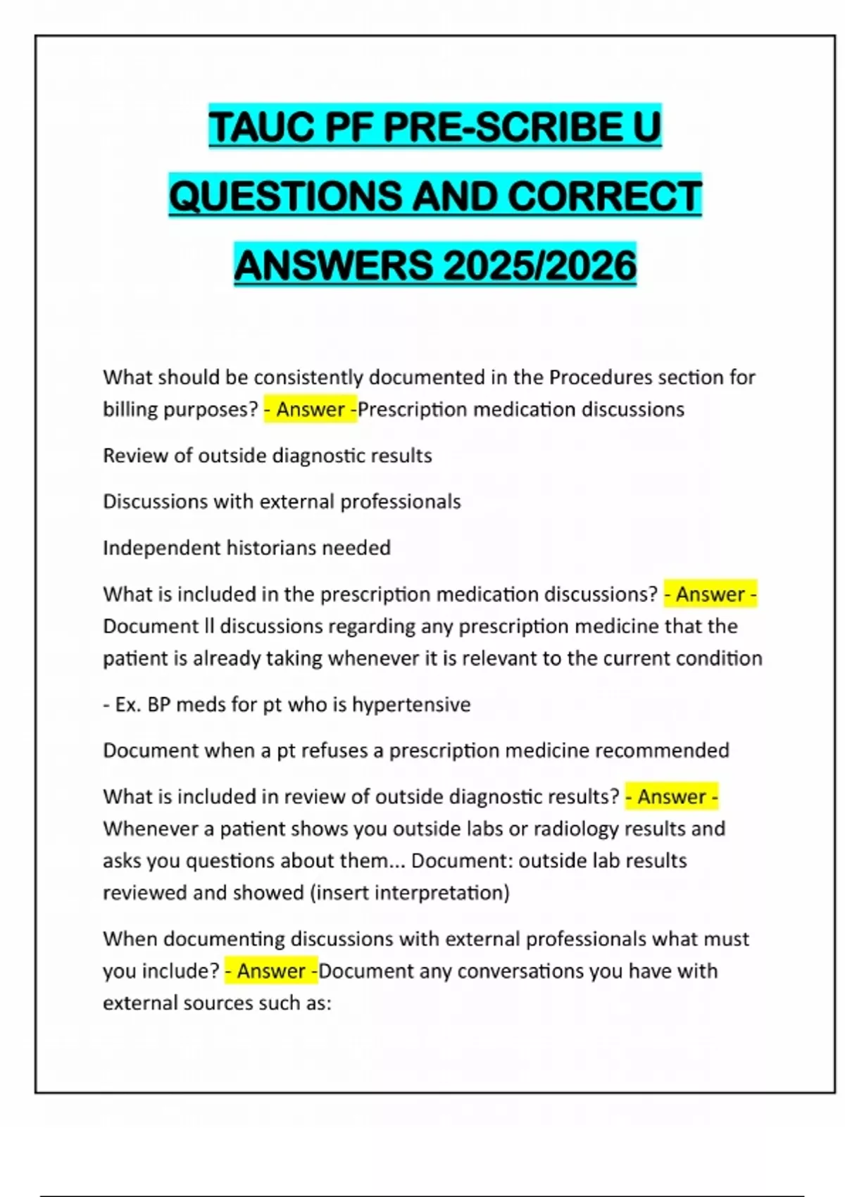TAUC PF PRE-SCRIBE U QUESTIONS AND CORRECT ANSWERS 2025/2026 What should be consistently documented in the Procedures section for billing purposes? - Answer -Prescription medication discussions Review of outside diagnostic results Discussions with external professionals Independent historians needed What is included in the prescription medication discussions? - Answer - Document ll discussions regarding any prescription medicine that the patient is already taking whenever it is relevant to the current condition - Ex. BP meds for pt who is hypertensive Document when a pt refuses a prescription medicine recommended What is included in review of outside diagnostic results? - Answer - Whenever a patient shows you outside labs or radiology results and asks you questions about them... Document: outside lab results reviewed and showed (insert interpretation) When documenting discussions with external professionals what must you include? - Answer -Document any conversations you have with external sources such as:-ER triage nurse -Urgent specialist -External provider involved w/ pts care -Non-healthcare professionals involved in pts management What do you document when independent historians are needed? - Answer -When a pt is unable to provide a complete or reliable hx document discussions with another historian When selecting a dx modifier what should you not do? - Answer -Do not select any of the three choices in the top under "uses for coding" -uncomplicated -systemic symptoms -poses a threat to life or bodily functions What do you select instead when selecting a dx modifier? - Answer - Choose the numbered choices from the bottom section (top 4) -Acute -Chronic -Incidental lesion/mass Bottoms 6 are additions to top 4 What should all fractures be referred to as? - Answer -Clinical not possible and you must include an associated fracture dx Should you document any refused procedures in the procedure note? - Answer -yes