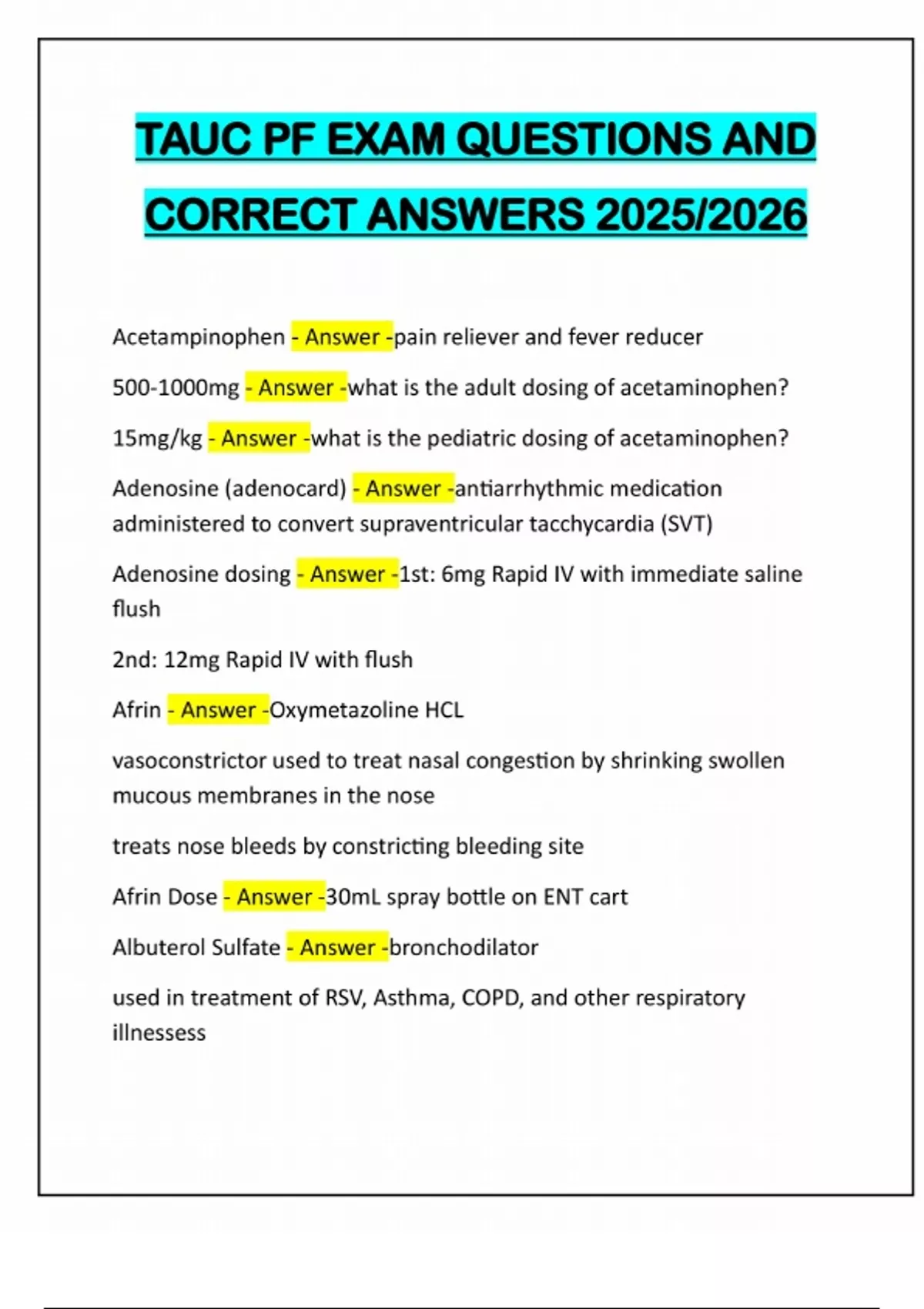 TAUC PF EXAM QUESTIONS AND CORRECT ANSWERS 2025/2026 Acetampinophen - Answer -pain reliever and fever reducer 500-1000mg - Answer -what is the adult dosing of acetaminophen? 15mg/kg - Answer -what is the pediatric dosing of acetaminophen? Adenosine (adenocard) - Answer -antiarrhythmic medication administered to convert supraventricular tacchycardia (SVT) Adenosine dosing - Answer -1st: 6mg Rapid IV with immediate saline flush 2nd: 12mg Rapid IV with flush Afrin - Answer -Oxymetazoline HCL vasoconstrictor used to treat nasal congestion by shrinking swollen mucous membranes in the nose treats nose bleeds by constricting bleeding site Afrin Dose - Answer -30mL spray bottle on ENT cart Albuterol Sulfate - Answer -bronchodilator used in treatment of RSV, Asthma, COPD, and other respiratory illnessessAlbuterol Sulfate Dose - Answer -2.5mg/3mL in a solution given per nebulizer inhalant Duoneb Treatment - Answer -Albuterol and Ipratopium Bromide (atrovent) mixed as an inhalant Albuterol sulfate - Answer -can cause an increase in heart rate/unevenness, nervousness, and tremors Aspirin - Answer -Antiplatelet medication administered to patients who may be experiencing heart attacks to prevent blood clots from forming Aspirin Dose - Answer -81-324mg (chewable 81mg tablets) Atropine - Answer -administered to treat patients experiencing symptomatic bradycardia (decreased heart rate) Atropine Dose - Answer -0.5mg IV Cefazolin (Ancef) - Answer -Cephalosporin antibiotic used to treat bacterial infections Cefazolin Dose - Answer -250mg-1g IM or IVPB in 500mL or 1000mL normal saline IV bag Ceftriaxone - Answer -rocephin Ceftriaxone - Answer -cephalosporin antibiotic used to treat bacterial infections When given IM, mixed with 1% lidocaine for comfort When given IV, mixed with saline Ceftriaxone dose - Answer -250mg-1g IM or 500mL or 1000mL normal saline IV bagClindamycin - Answer -Cleocin Clindamycin - Answer -antibiotic administered to treat bacterial infections Great alternative for patients who are allergic to penicillins Clindamycin Dose - Answer -300-900mg IM or IVPB in 500mL or 1000mL normal saline IV b