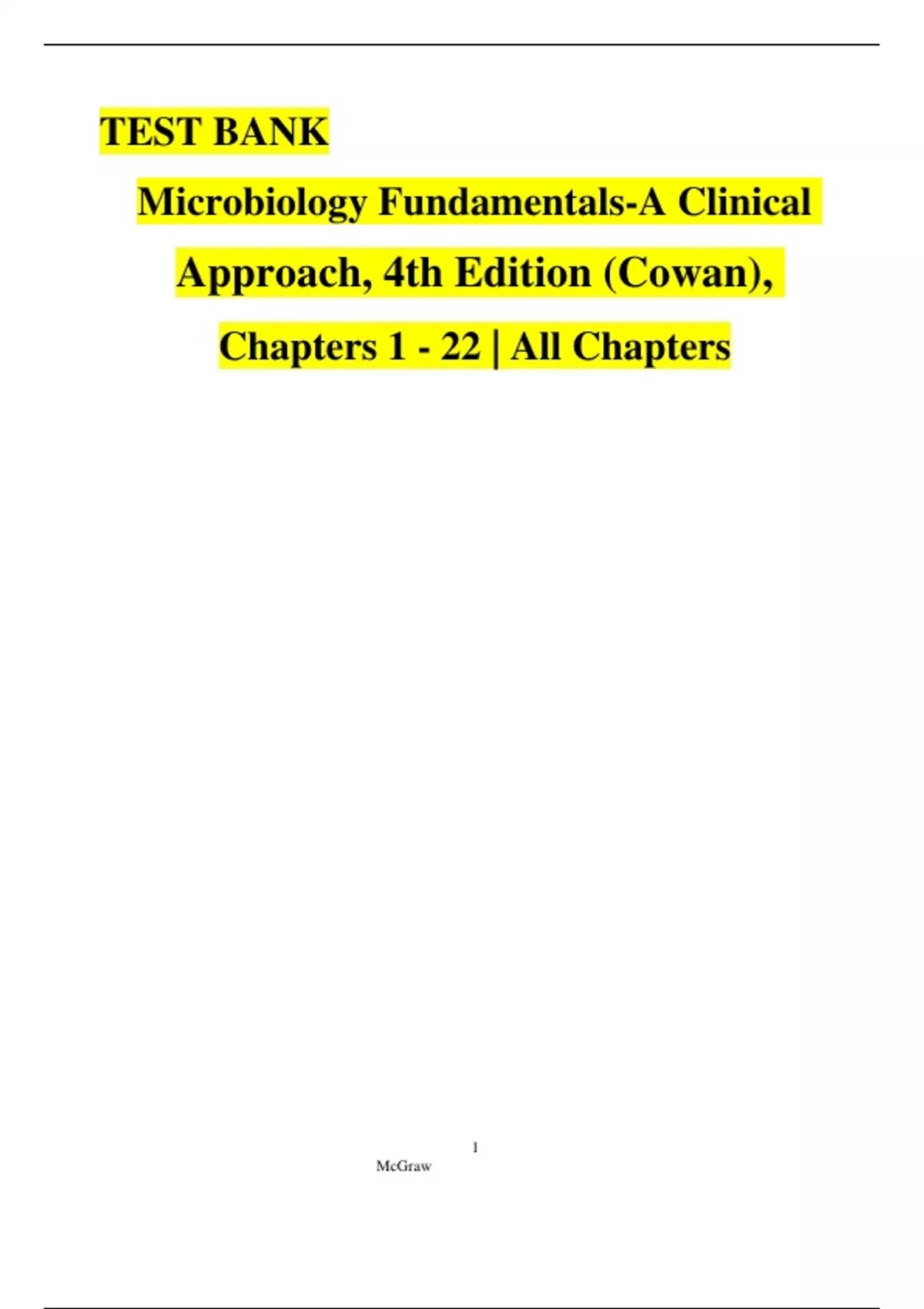 This document contains the full test bank for Microbiology Fundamentals: A Clinical Approach (4th Edition) by Marjorie Kelly Cowan, covering all 22 chapters. It includes a wide range of multiple-choice questions with correct answers, thoroughly addressing key microbiology concepts such as microbial structure, genetics, immunity, pathogenesis, clinical cases, and infectious diseases. This resource is designed for thorough exam prep and classroom support.