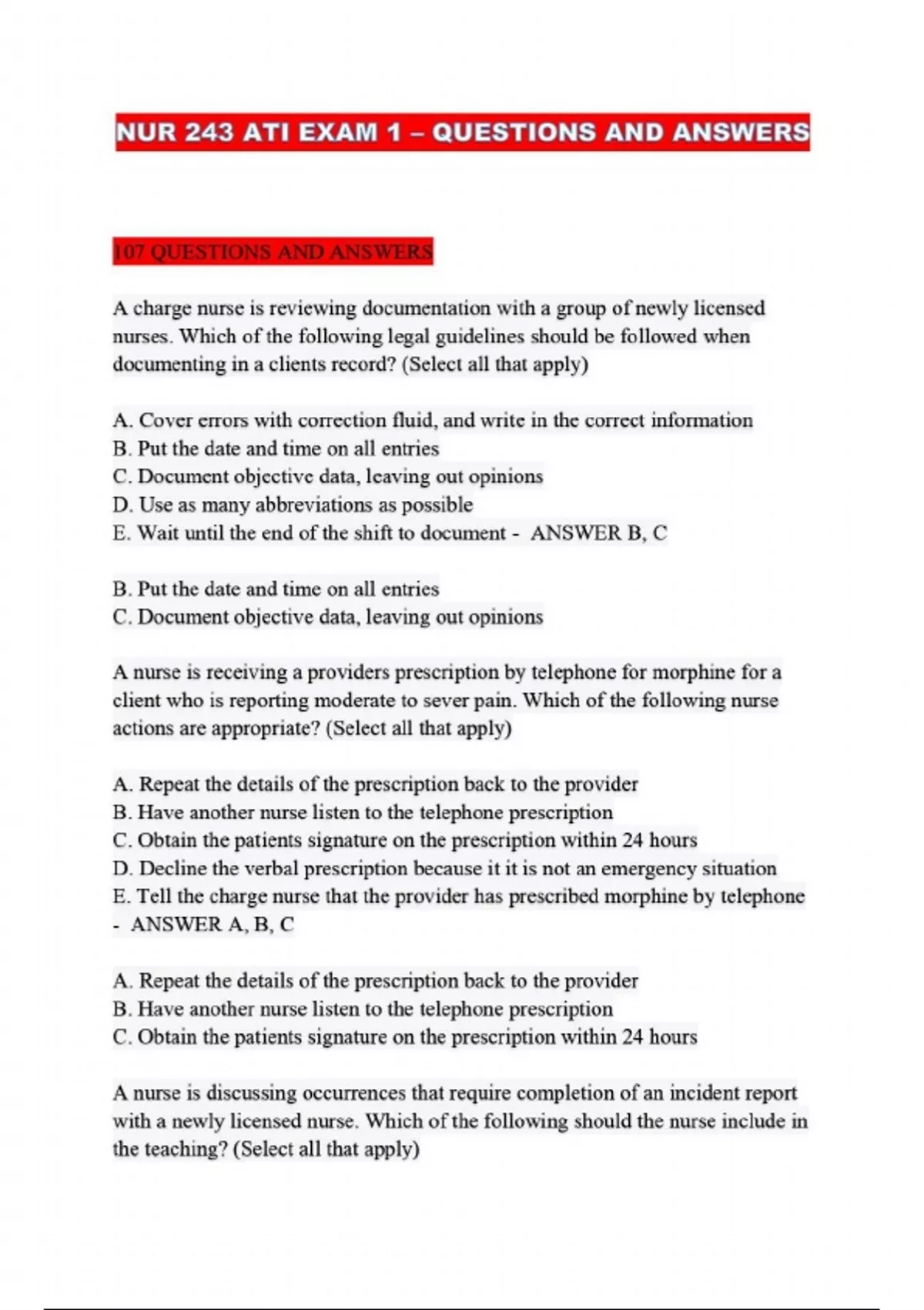 NUR 243 ATI EXAM 1 – QUESTIONS AND ANSWERS ....