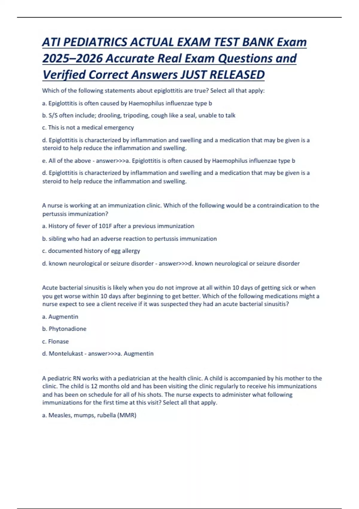 This comprehensive test bank contains accurate, scenario-based questions and verified correct answers aligned with the 2025–2026 ATI Pediatrics exam. Topics include growth and development, infectious diseases, immunizations, respiratory conditions, fluid and electrolyte imbalances, cardiac and endocrine disorders, injury prevention, and pediatric medication management. Designed to support NCLEX-PN/RN and ATI success, the document reflects real pediatric care situations with updated clinical standards and rationale-based responses.