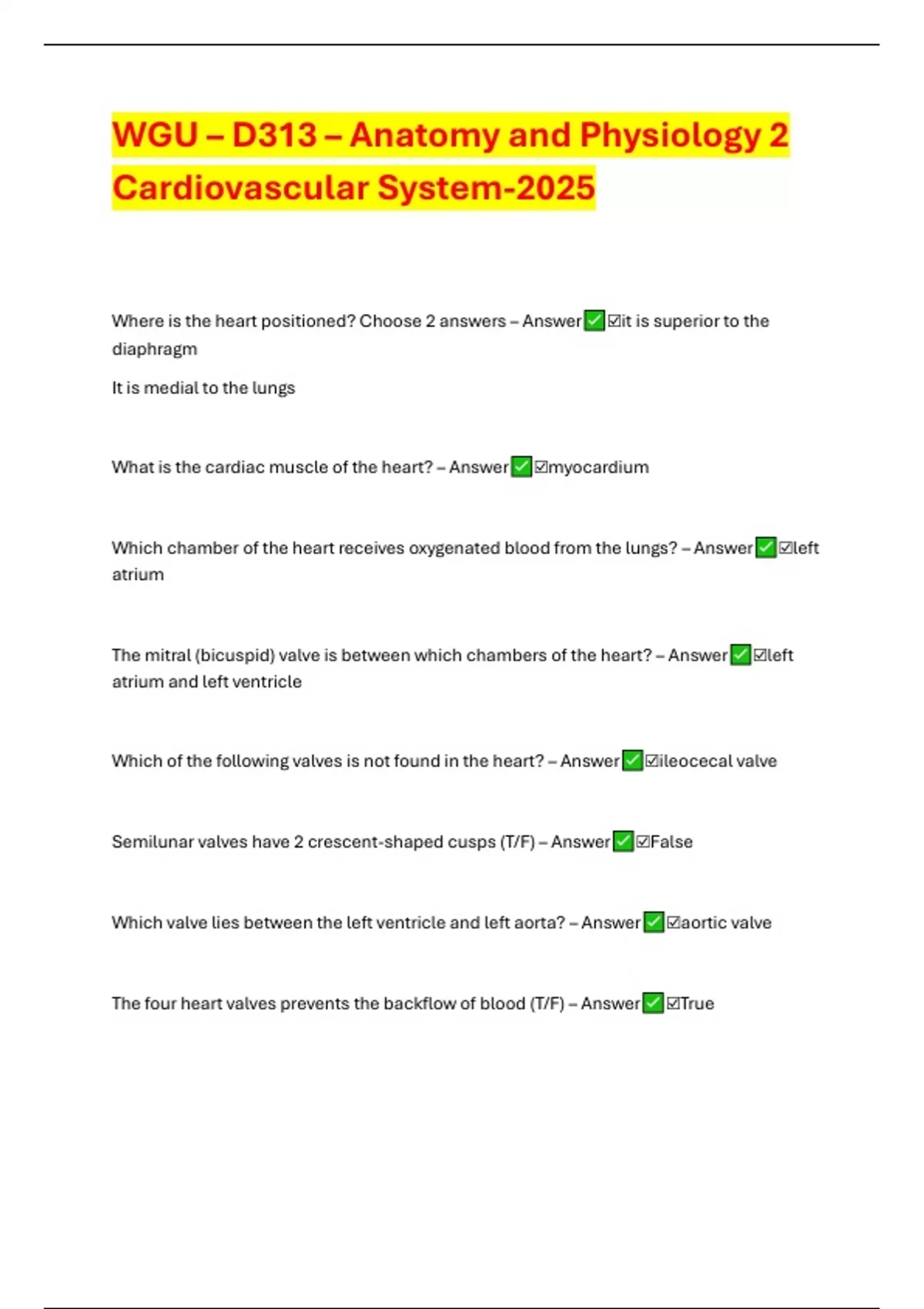 WGU – D313 – Anatomy and Physiology 2 Cardiovascular System-2025