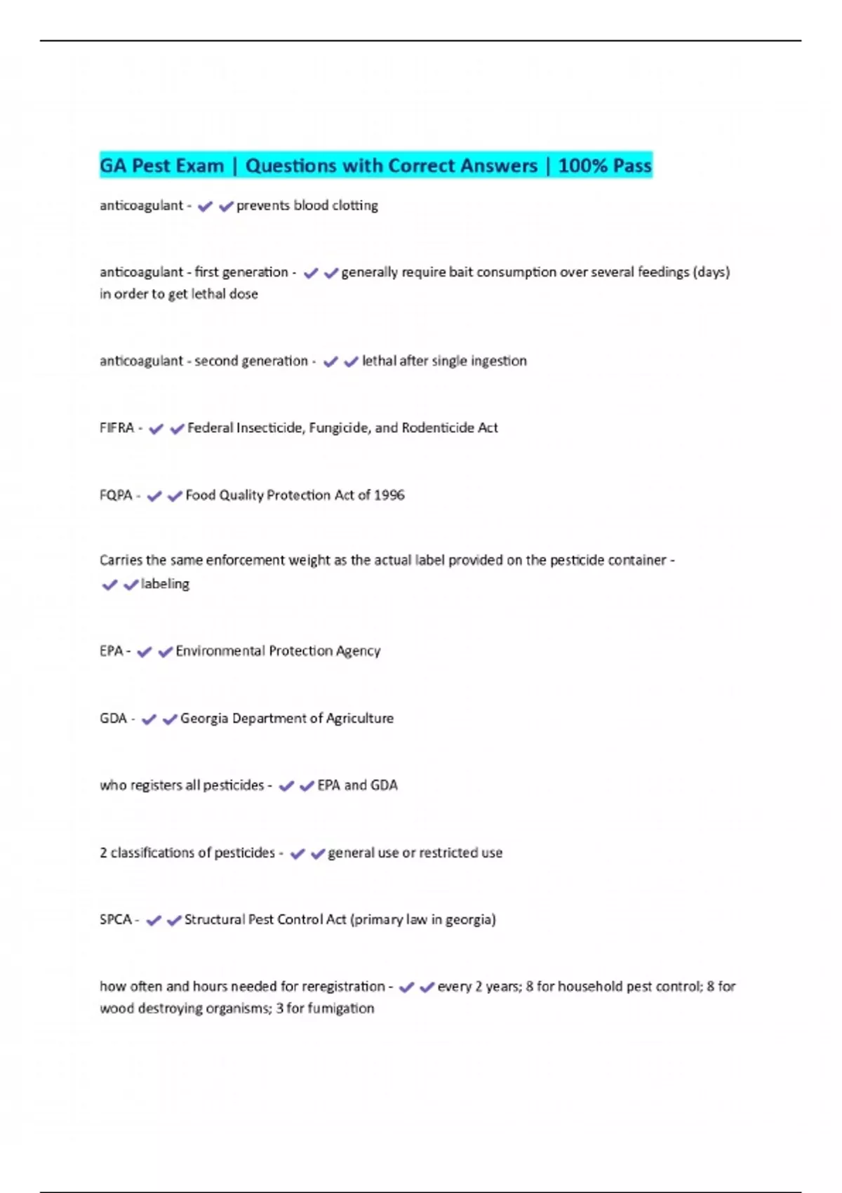GA Pest Exam | Questions with Correct Answers | 100% Pass