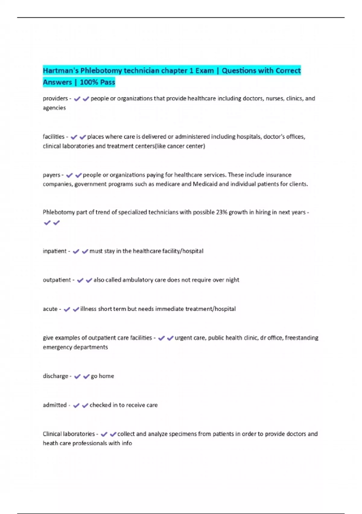 Hartman's Phlebotomy technician chapter 1 Exam | Questions with Correct Answers | 100% Pass