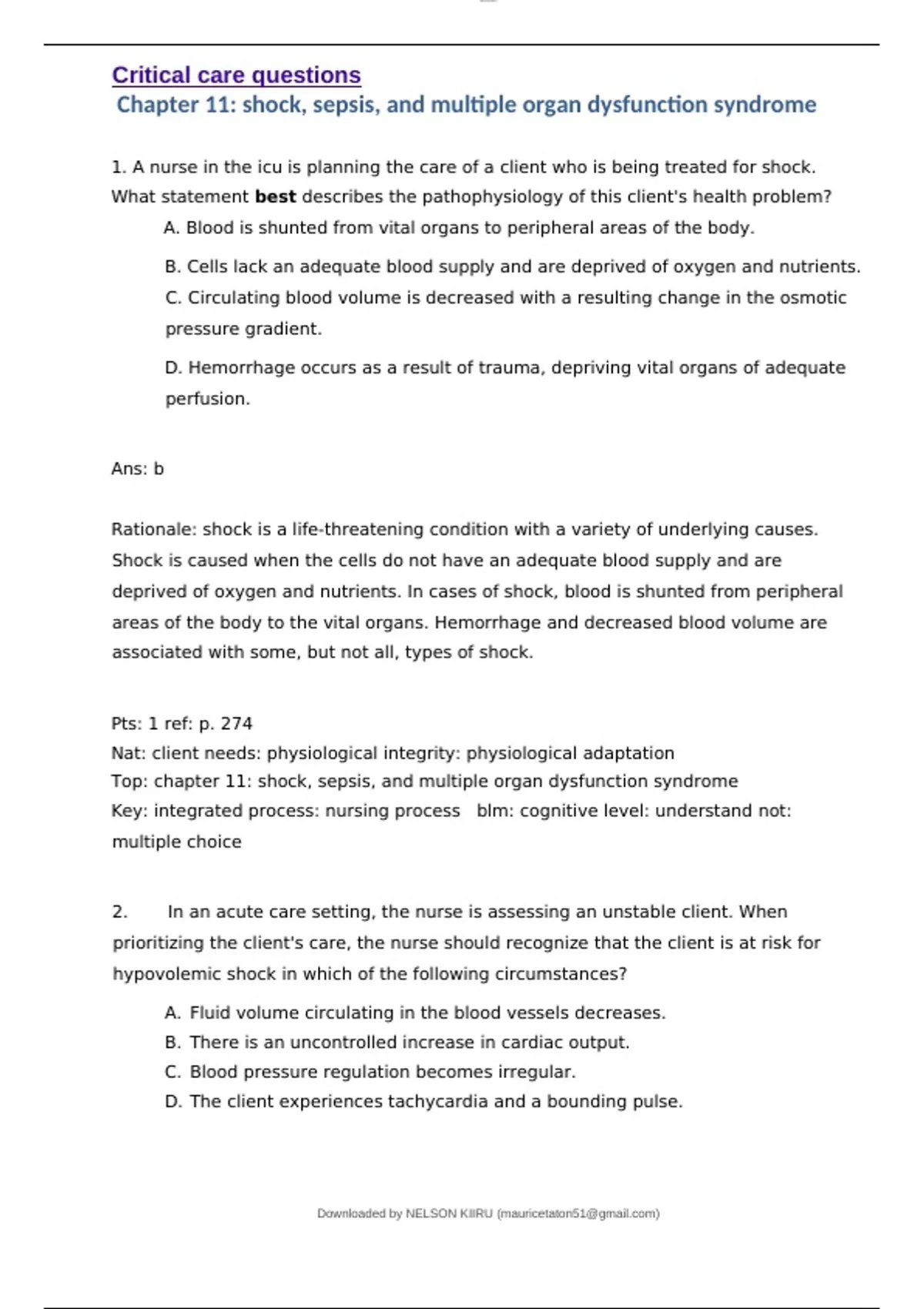 Critical care questions Chapter 11: shock, sepsis, and multiple organ dysfunction syndromeA nurse in the icu is planning the care of a client who is being treated for shock. What statement best describes the pathophysiology of this client's health problem? A. Blood is shunted from vital organs to peripheral areas of the body. B. Cells lack an adequate blood supply and are deprived of oxygen and nutrients. C. Circulating blood volume is decreased with a resulting change in the osmotic pressure gradient. D. Hemorrhage occurs as a result of trauma, depriving vital organs of adequate perfusion. Ans: b Rationale: shock is a life-threatening condition with a variety of underlying causes. Shock is caused when the cells do not have an adequate blood supply and are deprived of oxygen and nutrients. In cases of shock, blood is shunted from peripheral areas of the body to the vital organs. Hemorrhage and decreased blood volume are associated with some, but not all, types of shockPts: 1 ref: p. 274 Nat: client needs: physiological integrity: physiological adaptation Top: chapter 11: shock, sepsis, and multiple organ dysfunction syndrome Key: integrated process: nursing process blm: cognitive level: understand not: multiple choice 2. In an acute care setting, the nurse is assessing an unstable client. When prioritizing the client's care, the nurse should recognize that the client is at risk for hypovolemic shock in which of the following circumstances? A. Fluid volume circulating in the blood vessels decreases. B. There is an uncontrolled increase in cardiac output. C. Blood pressure regulation becomes irregular. D. The client experiences tachycardia and a bounding pulse. Ans: a Rationale: hypovolemic shock is characterized by a decrease in intravascular volume. Cardiac output is decreased, blood pressure decreases, and pulse is fast, but weak.3. The emergency nurse is admitting a client experiencing a gi bleed who is believed to be in the compensatory stage of shock. What assessment finding would be most consistent with the early stage of compensation? A. Increased urine output B. Decreased heart rate C. Hyperactive bowel sounds D. Cool, clammy skin Ans: d Rationale: in the compensatory stage of shock, the body shunts blood from the organs, such as the skin and kidneys, to the brain and heart to ensure adequate blood supply. As a result, the client's skin is cool and clammy. Also in this compensatory stage, blood vessels vasoconstrict, the heart rate increases, bowel sounds are hypoactive, and the urine output decreases.