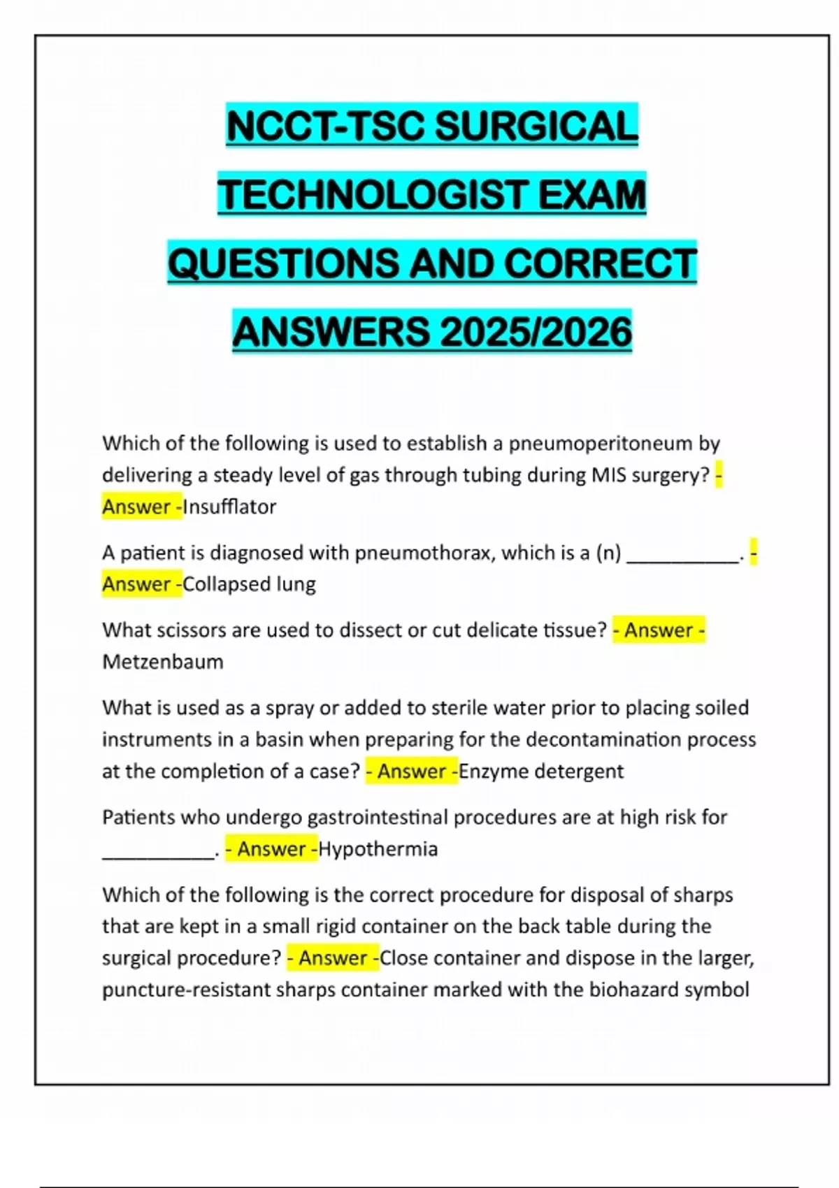 NCCT-TSC SURGICAL TECHNOLOGIST EXAM QUESTIONS AND CORRECT ANSWERS 2025/2026