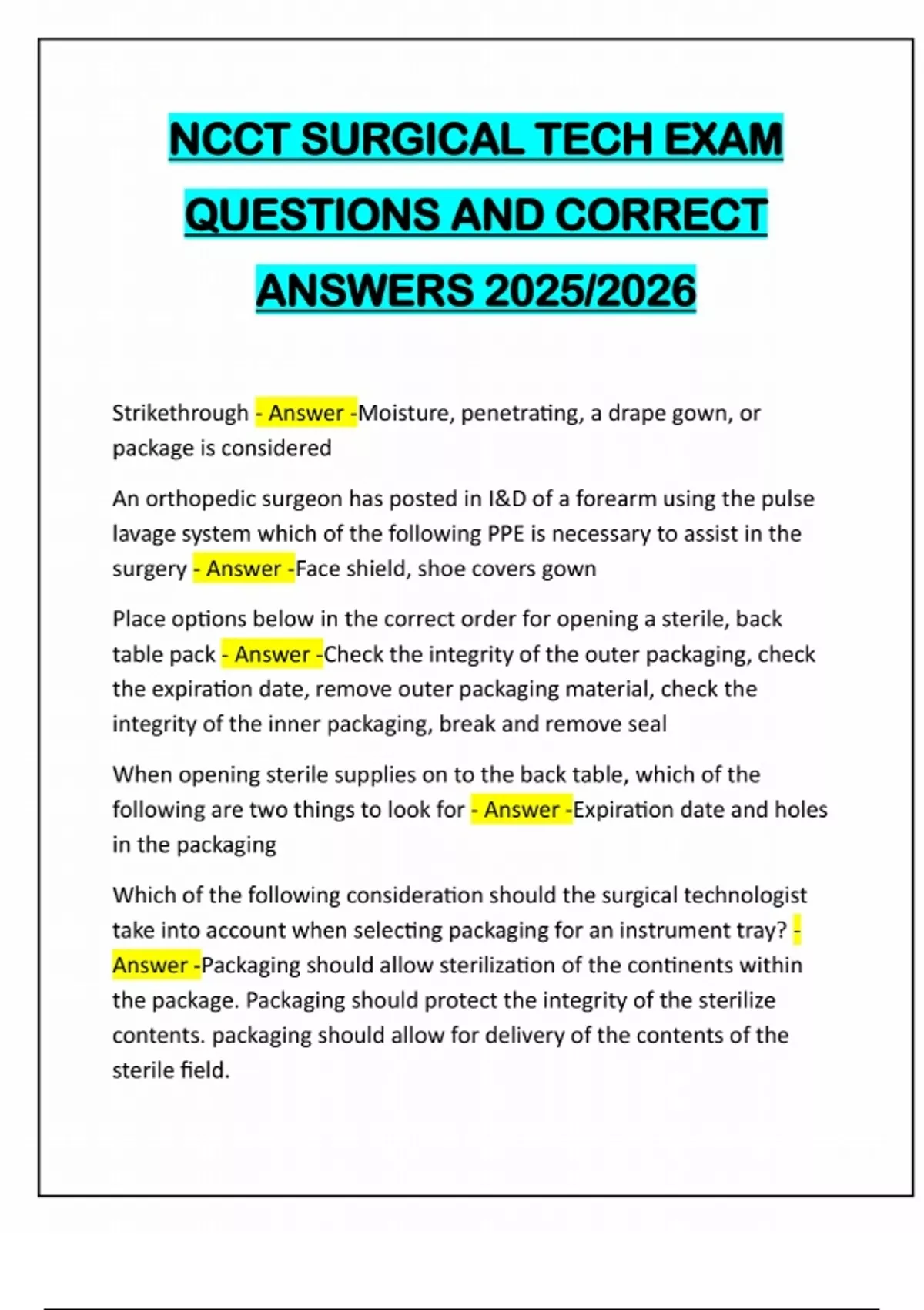 NCCT SURGICAL TECH EXAM QUESTIONS AND CORRECT ANSWERS 2025/2026 Strikethrough - Answer -Moisture, penetrating, a drape gown, or package is considered An orthopedic surgeon has posted in I&D of a forearm using the pulse lavage system which of the following PPE is necessary to assist in the surgery - Answer -Face shield, shoe covers gown Place options below in the correct order for opening a sterile, back table pack - Answer -Check the integrity of the outer packaging, check the expiration date, remove outer packaging material, check the integrity of the inner packaging, break and remove seal When opening sterile supplies on to the back table, which of the following are two things to look for - Answer -Expiration date and holes in the packaging Which of the following consideration should the surgical technologist take into account when selecting packaging for an instrument tray? - Answer -Packaging should allow sterilization of the continents within the package. Packaging should protect the integrity of the sterilize contents. packaging should allow for delivery of the contents of the sterile field.Which of the following should the surgical technologist check before opening a sterile wrapped package - Answer -Integrity of the package and external chemical indicator Which of the following describes how to pour liquid from a container onto the sterile field is correct - Answer -Hold the bottle 12 inches above, but with only the tip of the bottle over the basin Which of the following does the surgical technologist verify when excepting a breast implant to the sterile field? - Answer -Sterility size and expiration Place the following actions in the correct order for hand scrubbing - Answer -Clean under the nails with a pick., Scrub the surfaces of the hand., Scrub the third of the arm above the hand., Scrub the third of the arm above the elbow., Rinse with the fingers pointing up.