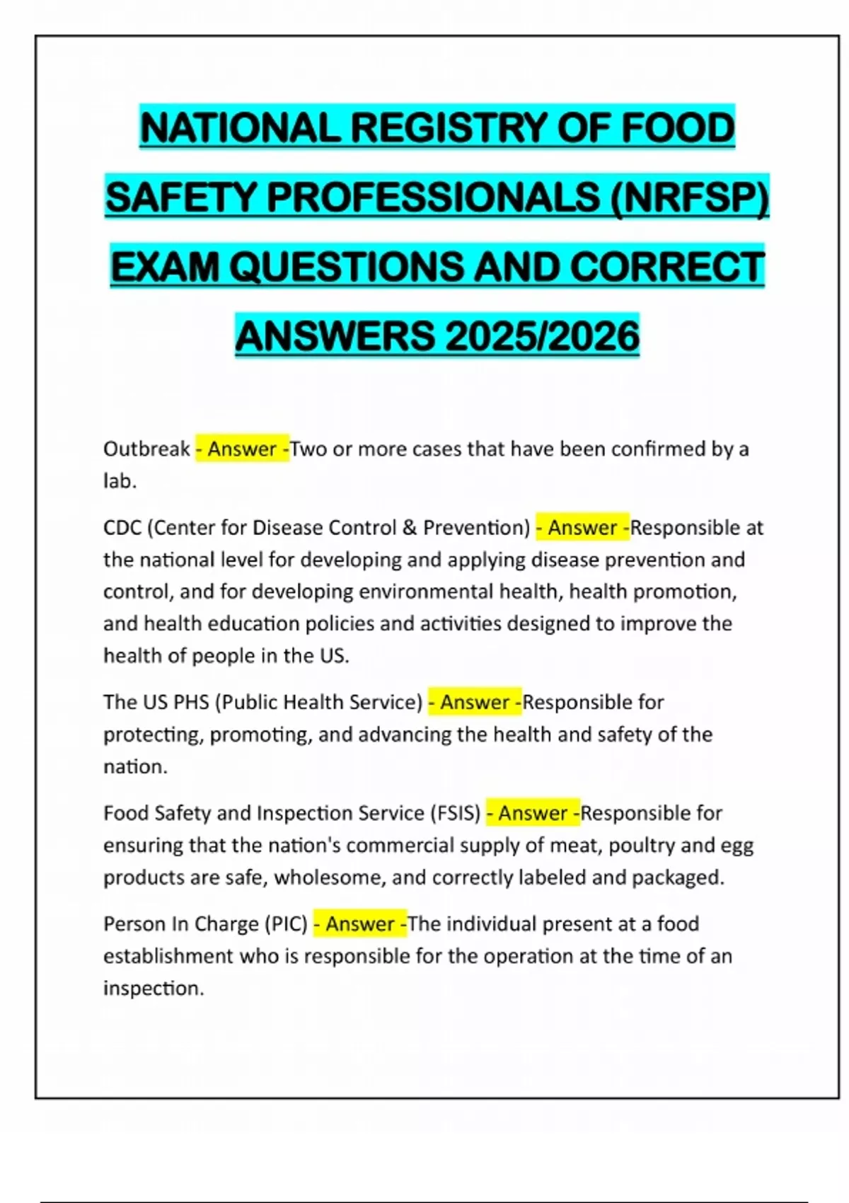NATIONAL REGISTRY OF FOOD SAFETY PROFESSIONALS (NRFSP) EXAM QUESTIONS AND CORRECT ANSWERS 2025/2026 Outbreak - Answer -Two or more cases that have been confirmed by a lab. CDC (Center for Disease Control & Prevention) - Answer -Responsible at the national level for developing and applying disease prevention and control, and for developing environmental health, health promotion, and health education policies and activities designed to improve the health of people in the US. The US PHS (Public Health Service) - Answer -Responsible for protecting, promoting, and advancing the health and safety of the nation. Food Safety and Inspection Service (FSIS) - Answer -Responsible for ensuring that the nation's commercial supply of meat, poultry and egg products are safe, wholesome, and correctly labeled and packaged. Person In Charge (PIC) - Answer -The individual present at a food establishment who is responsible for the operation at