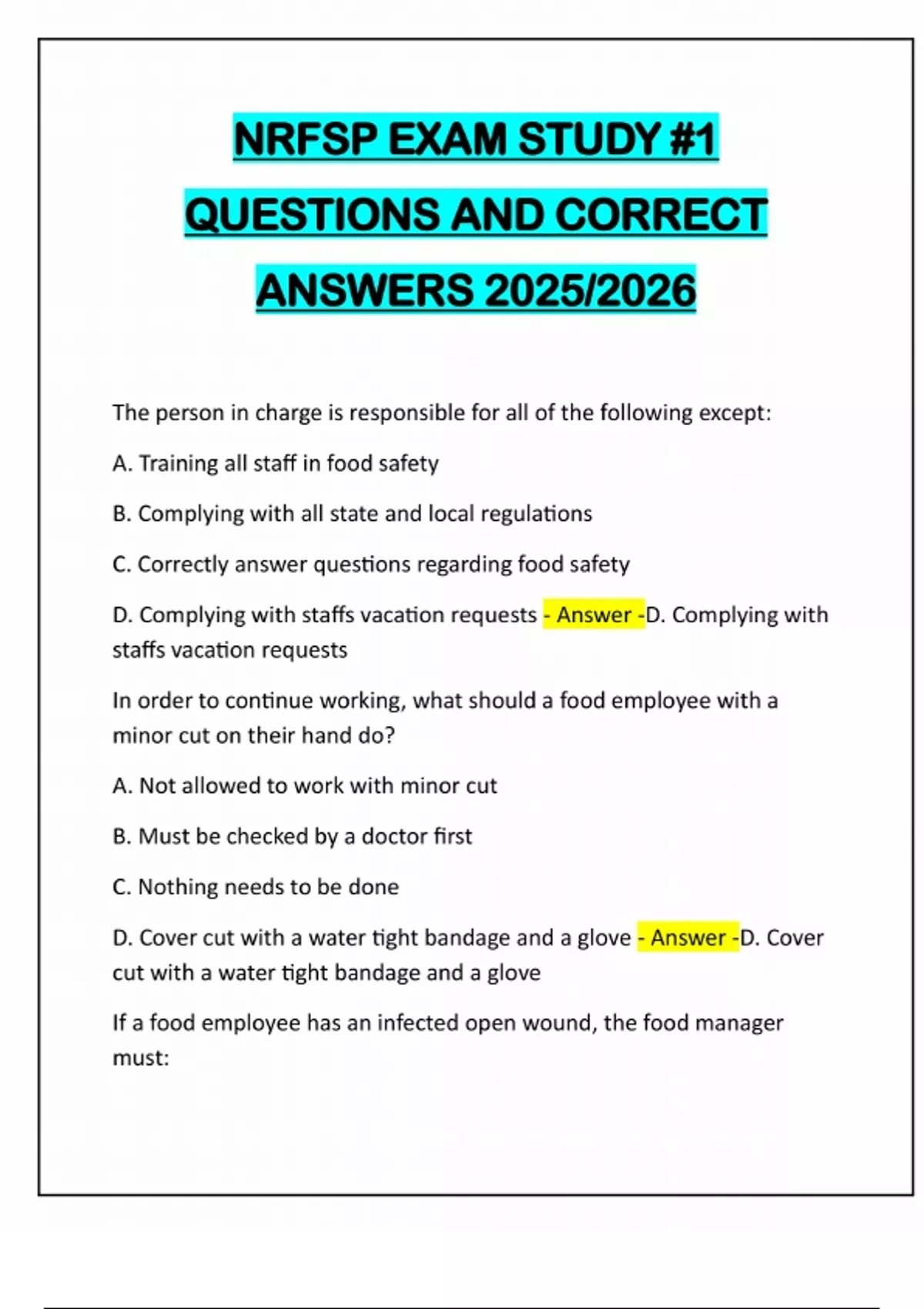 NRFSP EXAM STUDY #1 QUESTIONS AND CORRECT ANSWERS 2025/2026 The person in charge is responsible for all of the following except: A. Training all staff in food safety B. Complying with all state and local regulations C. Correctly answer questions regarding food safety D. Complying with staffs vacation requests - Answer -D. Complying with staffs vacation requests In order to continue working, what should a food employee with a minor cut on their hand do? A. Not allowed to work with minor cut B. Must be checked by a doctor first C. Nothing needs to be done D. Cover cut with a water tight bandage and a glove - Answer -D. Cover cut with a water tight bandage and a glove If a food employee has an infected open wound, the food manager must:A. Restrict the employee from working with the open food B. Send employee to a doctor C. Allow the employee to work only with salads D. Exclude the employee for working until a letter from a doctor is received - Answer -A. Restrict the employee from working with the open food All of the following are used to handle ready to eat foods except: A. Bare hands B. Tongs C. Gloved hands D. Deli paper - Answer -A. Bare hands It is most important for an employee to use proper hand washing techniques after they: A. Talk on the phone B. Use a restroom C. Take an order D. Drink from a closed container - Answer -B. Use a restroom An inspection can occur only: A. When the person in charge is present B. When the inspector notified the facility 24 hours in advance C. When the facility is open or during reasonable hours