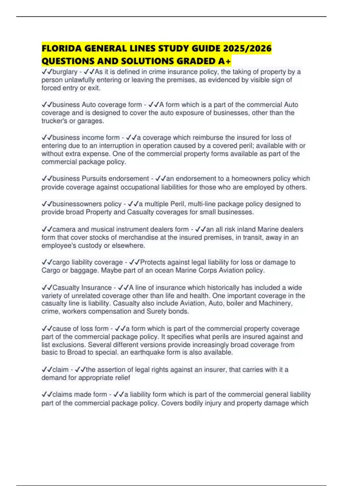 FLORIDA GENERAL LINES STUDY GUIDE 2025/2026 QUESTIONS AND SOLUTIONS GRADED A+