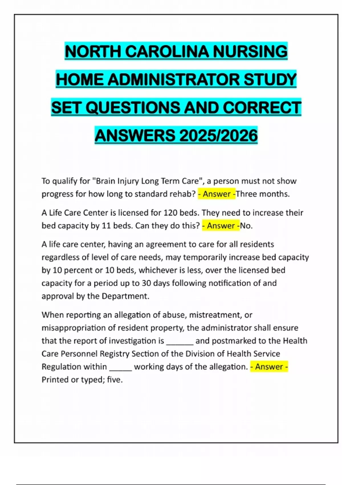 NORTH CAROLINA NURSING HOME ADMINISTRATOR STUDY SET QUESTIONS AND CORRECT ANSWERS 2025/2026