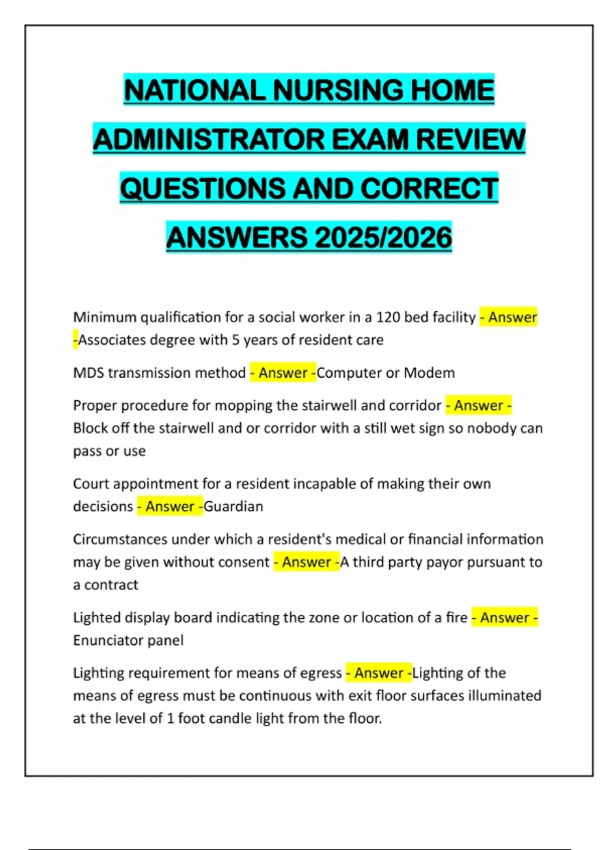 NATIONAL NURSING HOME ADMINISTRATOR EXAM REVIEW QUESTIONS AND CORRECT ANSWERS 2025/2026 Minimum qualification for a social worker in a 120 bed facility - Answer -Associates degree with 5 years of resident care MDS transmission method - Answer -Computer or Modem Proper procedure for mopping the stairwell and corridor - Answer - Block off the stairwell and or corridor with a still wet sign so nobody can pass or use Court appointment for a resident incapable of making their own decisions - Answer -Guardian Circumstances under which a resident's medical or financial information may be given without consent - Answer -A third party payor pursuant to a contract Lighted display board indicating the zone or location of a fire - Answer - Enunciator panel Lighting requirement for means of egress - Answer -Lighting of the means of egress must be continuous with exit floor surfaces illuminated at the level of 1 foot candle light from the floor.Primary purpose of closing doors in case of a fire - Answer -Contain the fire Most effective method to increase occupancy - Answer -Word of mouth Word of mouth - Answer -is most effective to increase occupancy. Planned activities for residents - Answer -A facility must provide planned activities for residents. Participation in planned activities - Answer -Residents are required to participate in the planned activities that the majority of residents request. Staff member speaking native language - Answer -The administrator should tell the staff member she is violating resident rights. Liability coverage for dropped resident - Answer -If an employee accidentally drops a resident, the facility is covered under General Liability insurance. Reporting deaths related to medical devices - Answer -All deaths related to a medical device must be reported to the Food and Drug Administration. Nurse's action during clergyman visit - Answer -The nurse should ask the resident if she wants her to leave. Calculating medication error - Answer -The number of errors observed divided by the opportunities for error times 100. Fatal medication error - Answer -Giving the wrong amount of Insulin to a resident is considered a fatal error.