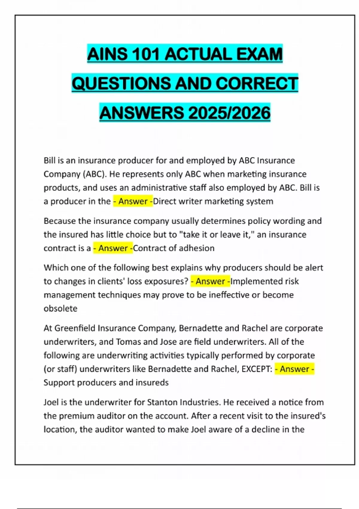AINS 101 ACTUAL EXAM QUESTIONS AND CORRECT ANSWERS 2025/2026 Bill is an insurance producer for and employed by ABC Insurance Company (ABC). He represents only ABC when marketing insurance products, and uses an administrative staff also employed by ABC. Bill is a producer in the - Answer -Direct writer marketing system Because the insurance company usually determines policy wording and the insured has little choice but to "take it or leave it," an insurance contract is a - Answer -Contract of adhesion Which one of the following best explains why producers should be alert to changes in clients' loss exposures? - Answer -Implemented risk management techniques may prove to be ineffective or become obsolete At Greenfield Insurance Company, Bernadette and Rachel are corporate underwriters, and Tomas and Jose are field underwriters. All of the following are underwriting activities typically performed by corporate (or staff) underwriters like Bernadette and Rachel, EXCEPT: - Answer - Support producers and insureds Joel is the underwriter for Stanton Industries. He received a notice from the premium auditor on the account. After a recent visit to the insured's location, the auditor wanted to make Joel aware of a decline in thebusiness and some questionable business practices. Which one of the following types of hazards is the auditor identifying? - Answer -Moral hazards Moral hazards - Answer -include questionable business practices or a failing business. James West is a claims rep with Hatters Insurance. As he learns how to handle a claim from start to finish, which one of the following best describes the correct order for him to follow during this process? - Answer -Identifying the policy, calculating a loss reserve, determining the cause of loss, preparing a loss statement Margaret was severely injured and scarred due to a recent accident. Which one of the following is an example of general damages Margaret received? - Answer -Compensation for disfigurement Donna is an insurance producer. She makes an appointment with potential policyholder Sandie to review her loss exposures. She asks Sandie to complete a questionnaire to assist her in this effort. Donna is conducting a - Answer -Risk management review Rachel is a new employee of Westley Insurance, and has been asked to review some existing policies to become familiar with the types of policies she will be working with. Which one of the following will Rachel find is true as she conducts her review? - Answer -Rachel finds the policy begins with a coverage overview and then goes into more coverage details. Sports, Inc. is looking to obtain a commercial property policy on its building for $400,000. If their insurer decides to charge them a rate of$0.50 per $100 of building insurance, what premium must Sports, Inc. pay? - Answer -$2,000 Destructive competition in the insu