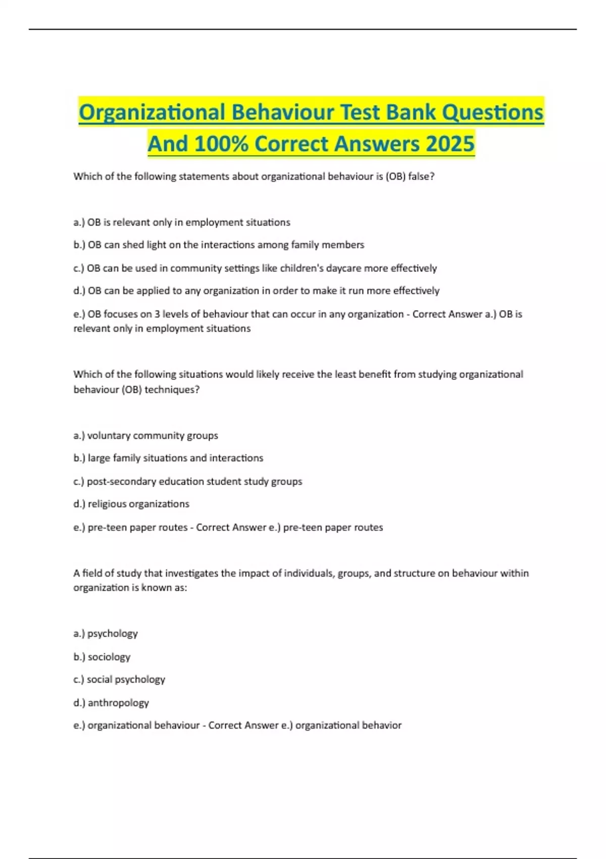 e.) organizational behaviour - Correct Answer e.) organizational behavior