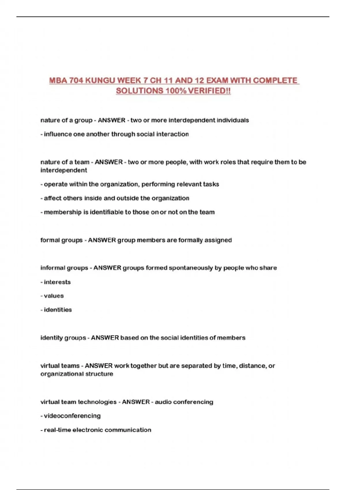 MBA 704 KUNGU WEEK 7 CH 11 AND 12 EXAM WITH COMPLETE SOLUTIONS 100% VERIFIED!!...