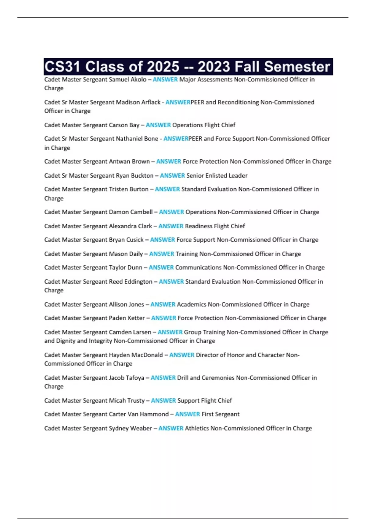 Cadet Master Sergeant Samuel Akolo – ANSWER Major Assessments Non-Commissioned Officer in Charge Cadet Sr Master Sergeant Madison Arflack - ANSWERPEER and Reconditioning Non-Commissioned Officer in Charge Cadet Master Sergeant Carson Bay – ANSWER Operations Flight Chief Cadet Sr Master Sergeant Nathaniel Bone - ANSWERPEER and Force Support Non-Commissioned Officer in Charge Cadet Master Sergeant Antwan Brown – ANSWER Force Protection Non-Commissioned Officer in Charge Cadet Sr Master Sergeant Ryan Buckton – ANSWER Senior Enlisted Leader Cadet Master Sergeant Tristen Burton – ANSWER Standard Evaluation Non-Commissioned Officer in Charge Cadet Master Sergeant Damon Cambell – ANSWER Operations Non-Commissioned Officer in Charge Cadet Master Sergeant Alexandra Clark – ANSWER Readiness Flight Chief Cadet Master Sergeant Bryan Cusick – ANSWER Force Support Non-Commissioned Officer in Charge Cadet Master Sergeant Mason Daily – ANSWER Training Non-Commissioned Officer in Charge Cadet Master Sergeant Taylor Dunn – ANSWER Communications Non-Commissioned Officer in Charge Cadet Master Sergeant Reed Eddington – ANSWER Standard Evaluation Non-Commissioned Officer in