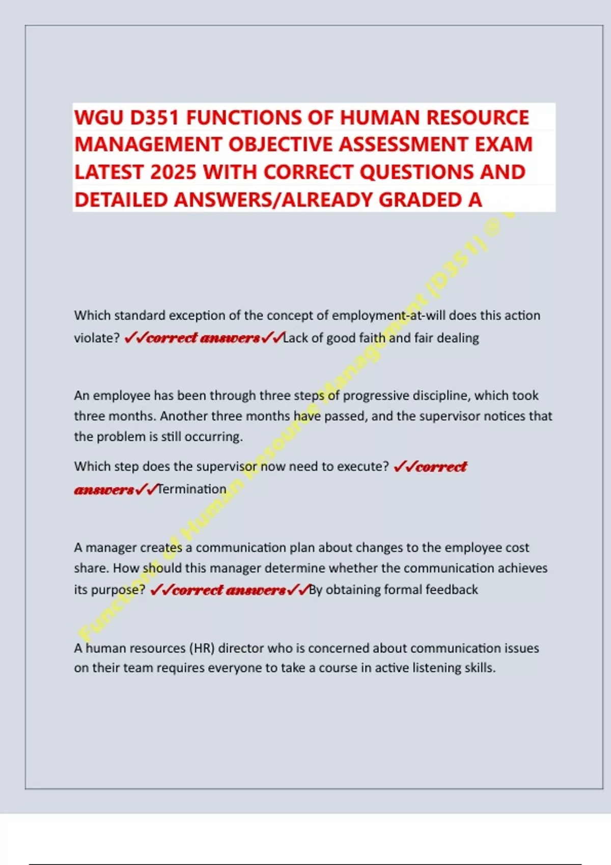 WGU D351 FUNCTIONS OF HUMAN RESOURCE MANAGEMENT OBJECTIVE ASSESSMENT EXAM LATEST 2025 WITH CORRECT QUESTIONS AND DETAILED ANSWERS/ALREADY GRADED A