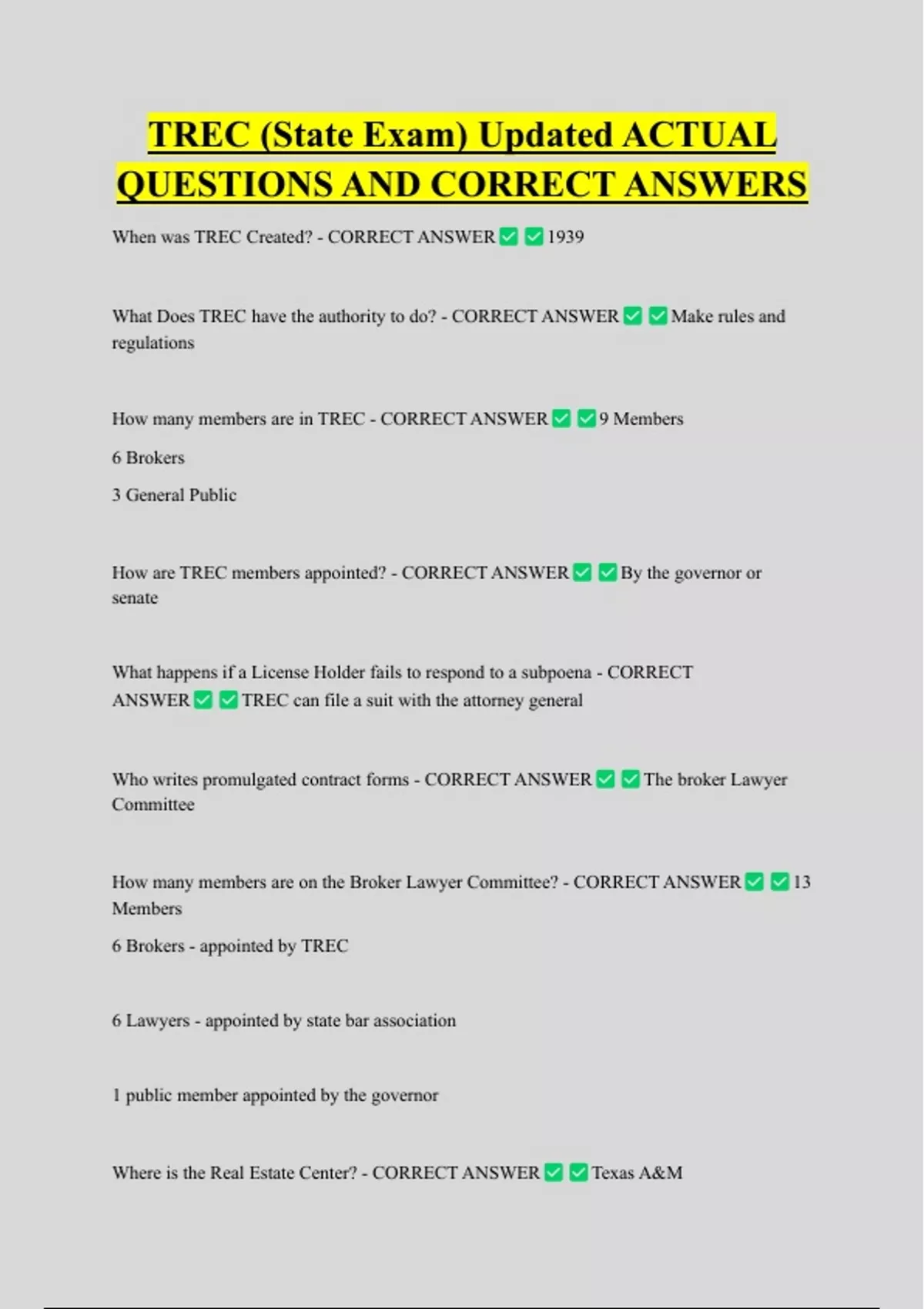 TREC (State Exam) Updated ACTUAL QUESTIONS AND CORRECT ANSWERS When was TREC Created? - CORRECT ANSWER 1939 What Does TREC have the authority to do? - CORRECT ANSWER regulations How many members are in TREC - CORRECT ANSWER Make rules and 9 Members 6 Brokers 3 General Public