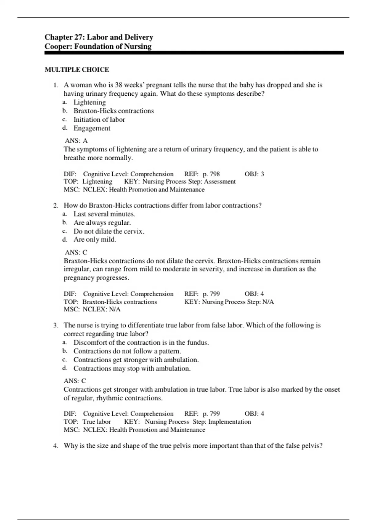 1. A woman who is 38 weeks’ pregnant tells the nurse that the baby has dropped and she is