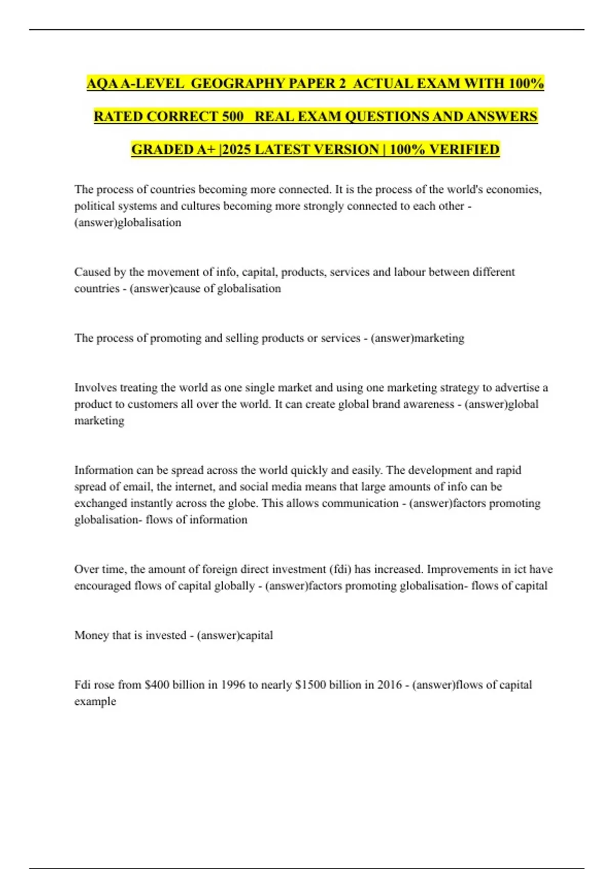 AQA A-LEVEL GEOGRAPHY PAPER 2 ACTUAL EXAM WITH 100% RATED CORRECT 500 REAL EXAM QUESTIONS AND ANSWERS GRADED A+ |2025 LATEST VERSION | 100% VERIFIED