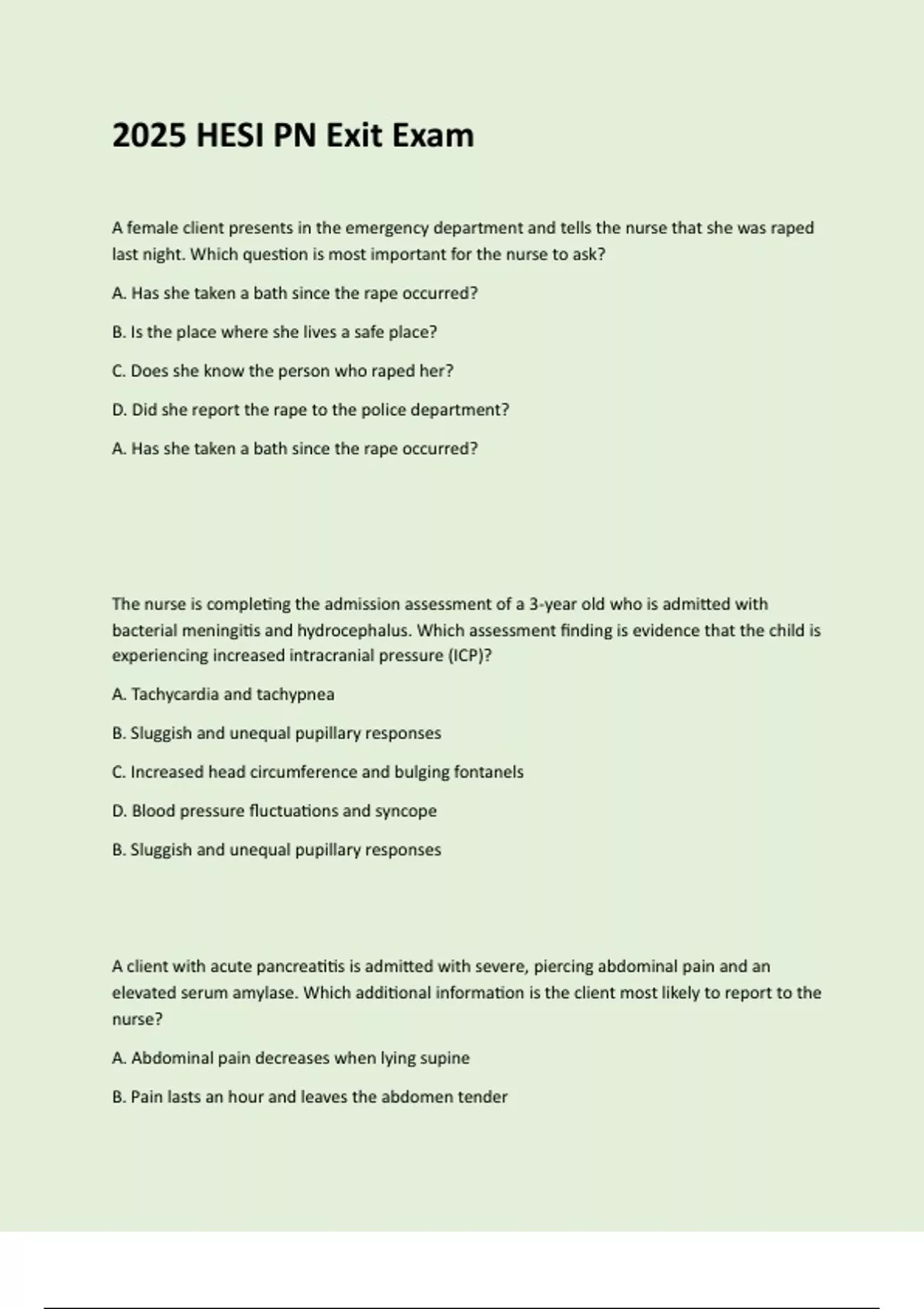 This document contains a comprehensive collection of all possible questions for the 2025 HESI PN Exit Exam. It covers a wide range of topics. The exam is structured to reflect real exam scenarios and includes both questions and accurate answer options to aid in effective preparation.
