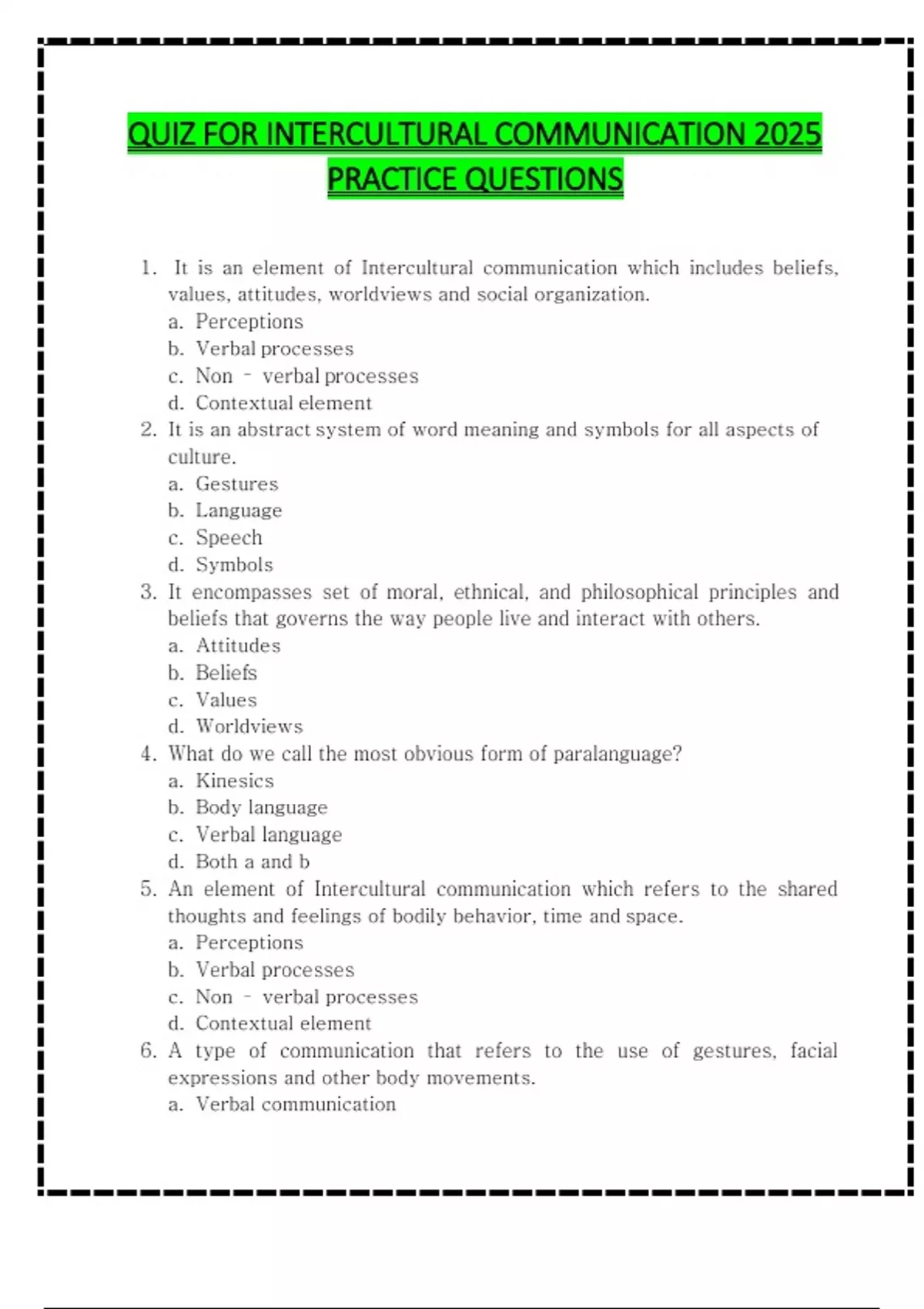 QUIZ FOR INTERCULTURAL COMMUNICATION 2025 PRACTICE QUESTIONS