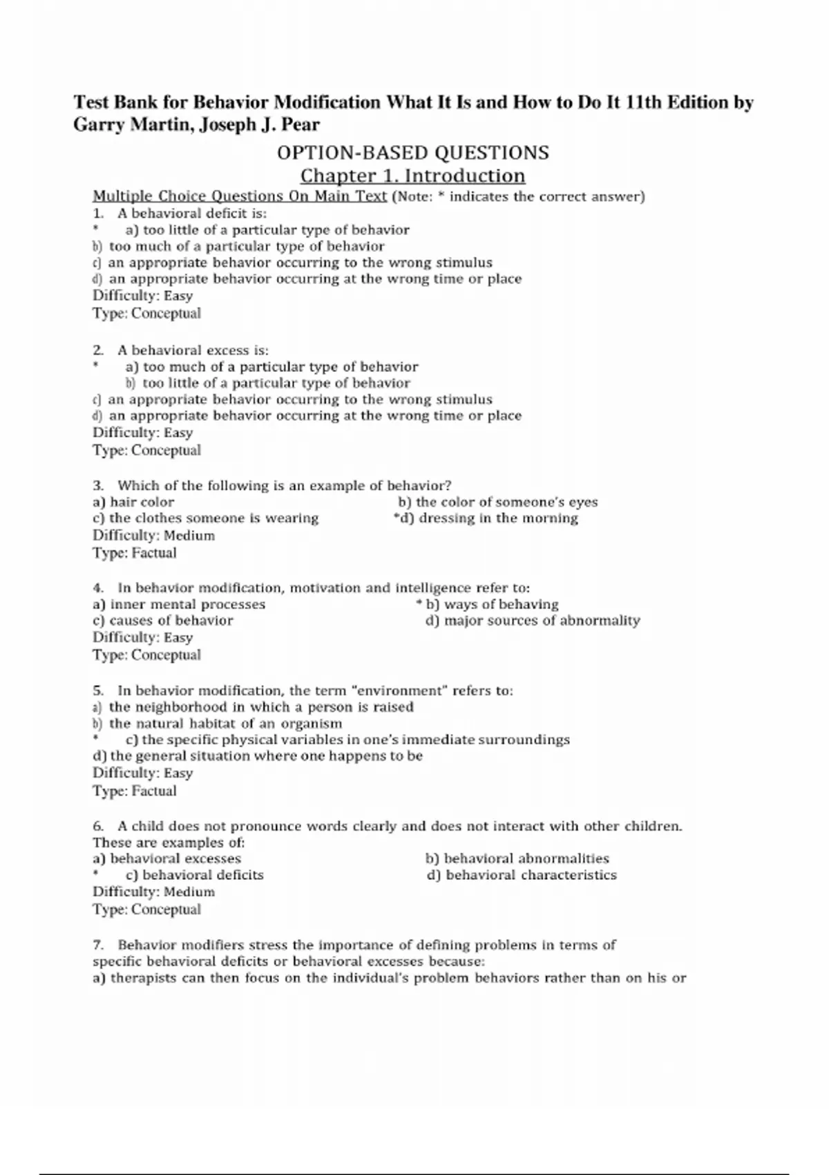 TEST BANK for Behavior Modification: What It Is and How To Do It 11th Edition by Garry Martin & Joseph J. Pear. ISBN-10 X ISBN-13 978-6. All Chapters 1-29. (Complete Download). TABLE OF CONTENTS Part I: The Behavior Modification Approach 1. Introduction 2. Areas of Application: An Overview 3. Defining, Measuring, and Recording Target Behavior 4. Doing Behavior Modification Research Part II: Basic Behavioral Principles and Procedures 5. Respondent (Classical, Pavlovian) Conditioning of Reflexive Behavior 6. Increasing a Behavior with Positive Reinforcement 7. Increasing Behavior with Conditioned Reinforcement 8. Decreasing a Behavior with Operant Extinction 9. Getting a New Behavior to Occur with Shaping 10. Developing Behavioral Persistence with Schedules of Reinforcement 11. Responding at the Right Time and Place: Operant Stimulus Discrimination and Stimulus Generalization 12. Changing the Control of a Behavior with Fading 13. Getting a New Sequence of Behaviors to Occur with Behavior Chaining 14. Differential Reinforcement Procedures to Decrease Behavior 15. Decreasing Behavior with Punishment 16. Establishing Behavior by Escape and Avoidance Conditioning 17. Respondent and Operant Conditioning Together 18. Transferring Behavior to New Settings and Making It Last: Programming of Generality of Behavior Change Part III: Capitalizing on Operant Antecedent Control Procedures 19. Antecedent Control: Rules and Goals 20. Antecedent Control: Modeling, Physical Guidance, and Situational Inducement 21. Antecedent Control: Motivation Part IV: Putting It All Together to Develop Effective Behavioral Programs 22. Functional Assessment of Causes of Problem Behavior 23. Planning, Applying, and Evaluating a Behavioral Program 24. Token Economies 25. Helping an Individual to Develop Self-Control Part V: Behavior Therapy for Psychological Disorders 26. Behavioral Approaches to Psychotherapy: Cognitive Restructuring, Self-Directed Coping Methods, and Mindfulness and Acceptance Procedures 27. Psychological Disorders Treated by Behavioral and Cognitive-Behavioral Therapies Part VI: A Historical Perspective and Ethical Issues 28. Giving it All Some Perspective: A Brief History 29. Ethical Issues