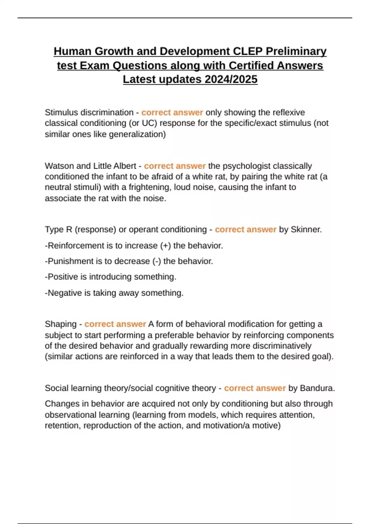 Human Growth and Development CLEP Preliminary test Exam Questions along with Certified Answers Latest updates 2024/2025 Stimulus discrimination - correct answer only showing the reflexive classical conditioning (or UC) response for the specific/exact stimulus (not similar ones like generalization) Watson and Little Albert - correct answer the psychologist classically conditioned the infant to be afraid of a white rat, by pairing the white rat (a neutral stimuli) with a frightening, loud noise, causing the infant to associate the rat with the noise. Type R (response) or operant conditioning - correct answer by Skinner. -Reinforcement is to increase (+) the behavior. -Punishment is to decrease (-) the behavior. -Positive is introducing something. -Negative is taking away something. Shaping - correct answer A form of behavioral modification for getting a subject to start performing a preferable behavior by reinforcing components of the desired behavior and gradually rewarding more discriminatively (similar actions are reinforced in a way that leads them to the desired goal). Social learning theory/social cognitive theory - correct answer by Bandura. Changes in behavior are acquired not only by conditioning but also through observational learning (learning from models, which requires attention, retention, reproduction of the action, and motivation/a motive) Vicarious reinforcement and vicarious punishment - correct answer seeing others reinforced or punished (respectively) for certain behaviors influences how the viewer behaves Psychodynamic/psychoanalytic personality theories - correct answer (most hold that personality is mainly unconscious) descendants of/based on Freud's theories. (key people: Freud and Erikson) Id, Ego, Superego - correct answer according to Freud's psychodynamic personality theory -occurs at birth, Pleasure principle; unconscious instincts; irrational; seeks instant gratification; contains the libido -Occurs around 6 months, reality principle; mediates id and reality; executive branch -occurs around 6 years old, morality principle, personal consciences, personal ideals Libido - correct answer sexual energy in the id. Freud. Repression - correct answer When unwanted/unacceptable thoughts are pushed down in the unconscious. (A defense mechanism recognized by Freud.)