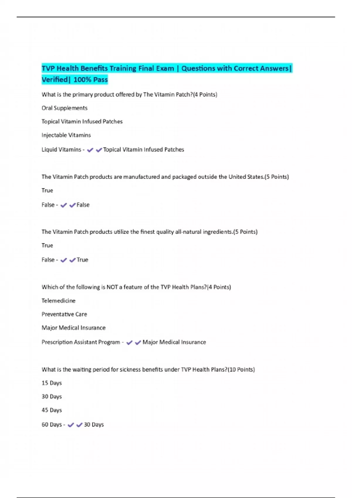 TVP Health Benefits Training Final Exam | Questions with Correct Answers| Verified| 100% Pass