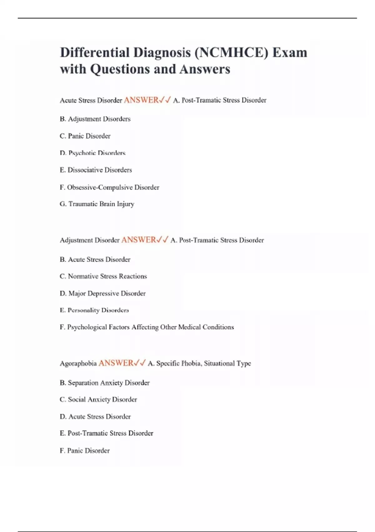 Differential Diagnosis (NCMHCE) Exam with Questions and Answers Acute Stress Disorder ANSWER A. Post-Tramatic Stress Disorder B. Adjustment Disorders C. Panic Disorder D. Psychotic Disorders E. Dissociative Disorders F. Obsessive-Compulsive Disorder G. Traumatic Brain Injury Adjustment Disorder ANSWER A. Post-Tramatic Stress Disorder B. Acute Stress Disorder C. Normative Stress Reactions D. Major Depressive Disorder E. Personality Disorders F. Psychological Factors Affecting Other Medical Conditions Agoraphobia ANSWER A. Specific Phobia, Situational Type B. Separation Anxiety Disorder C. Social Anxiety Disorder D. Acute Stress Disorder E. Post-Tramatic Stress Disorder F. Panic Disorder