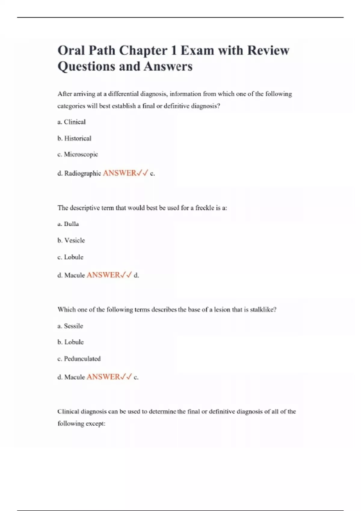 Oral Path Chapter 1 Exam with Review Questions and Answers After arriving at a differential diagnosis, information from which one of the following categories will best establish a final or definitive diagnosis? a. Clinical b. Historical c. Microscopic d. Radiographic ANSWER c. The descriptive term that would best be used for a freckle is a: a. Bulla b. Vesicle c. Lobule d. Macule ANSWER d. Which one of the following terms describes the base of a lesion that is stalklike? a. Sessile b. Lobule c. Pedunculated d. Macule ANSWER c. Clinical diagnosis can be used to determine the final or definitive diagnosis of all of the following except: