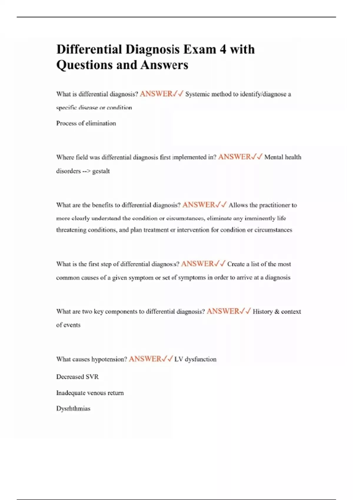 Differential Diagnosis Exam 4 with Questions and Answers What is differential diagnosis? ANSWER Systemic method to identify/diagnose a specific disease or condition Process of elimination Where field was differential diagnosis first implemented in? ANSWER Mental health disorders -- gestalt What are the benefits to differential diagnosis? ANSWER Allows the practitioner to more clearly understand the condition or circumstances, eliminate any imminently life threatening conditions, and plan treatment or intervention for condition or circumstances What is the first step of differential diagnosis? ANSWER Create a list of the most common causes of a given symptom or set of symptoms in order to arrive at a diagnosis What are two key components to differential diagnosis? ANSWER History & context of events What causes hypotension? ANSWER LV dysfunction Decreased SVR Inadequate venous return Dysrhthmias