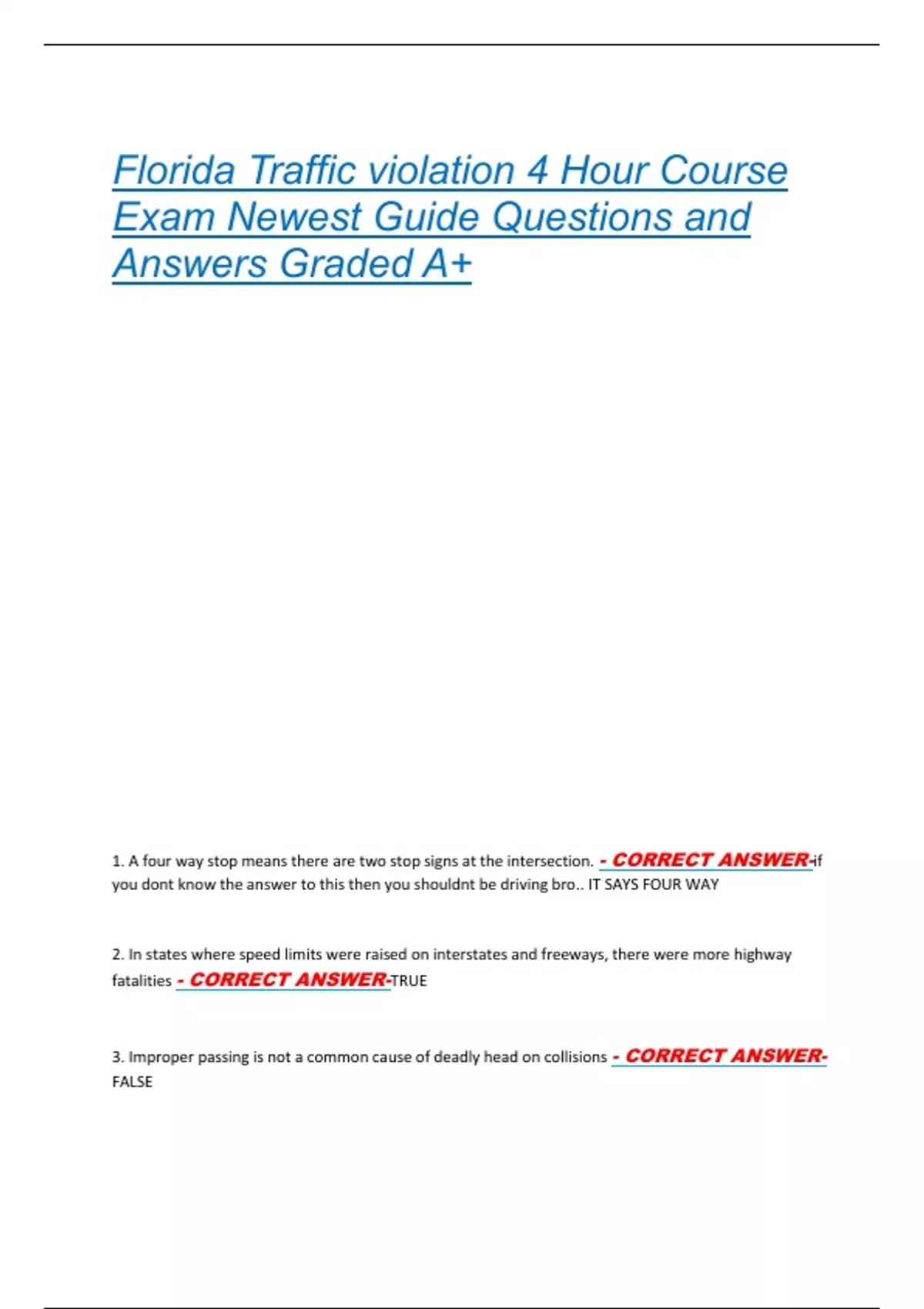 Florida Traffic violation 4 Hour Course Exam Newest Guide Questions and Answers Graded A+