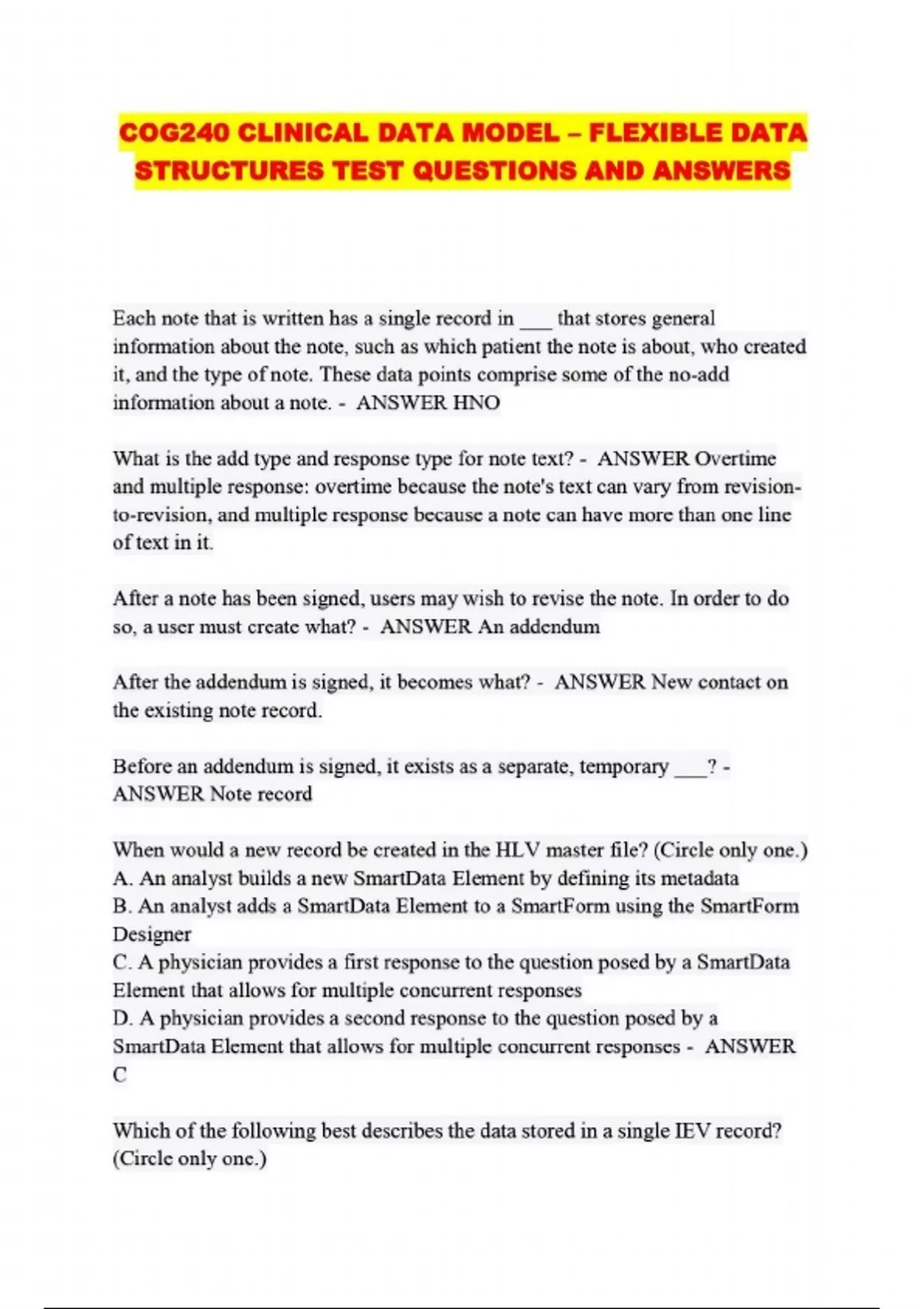 COG240 CLINICAL DATA MODEL – FLEXIBLE DATA STRUCTURES TEST QUESTIONS AND ANSWERS...