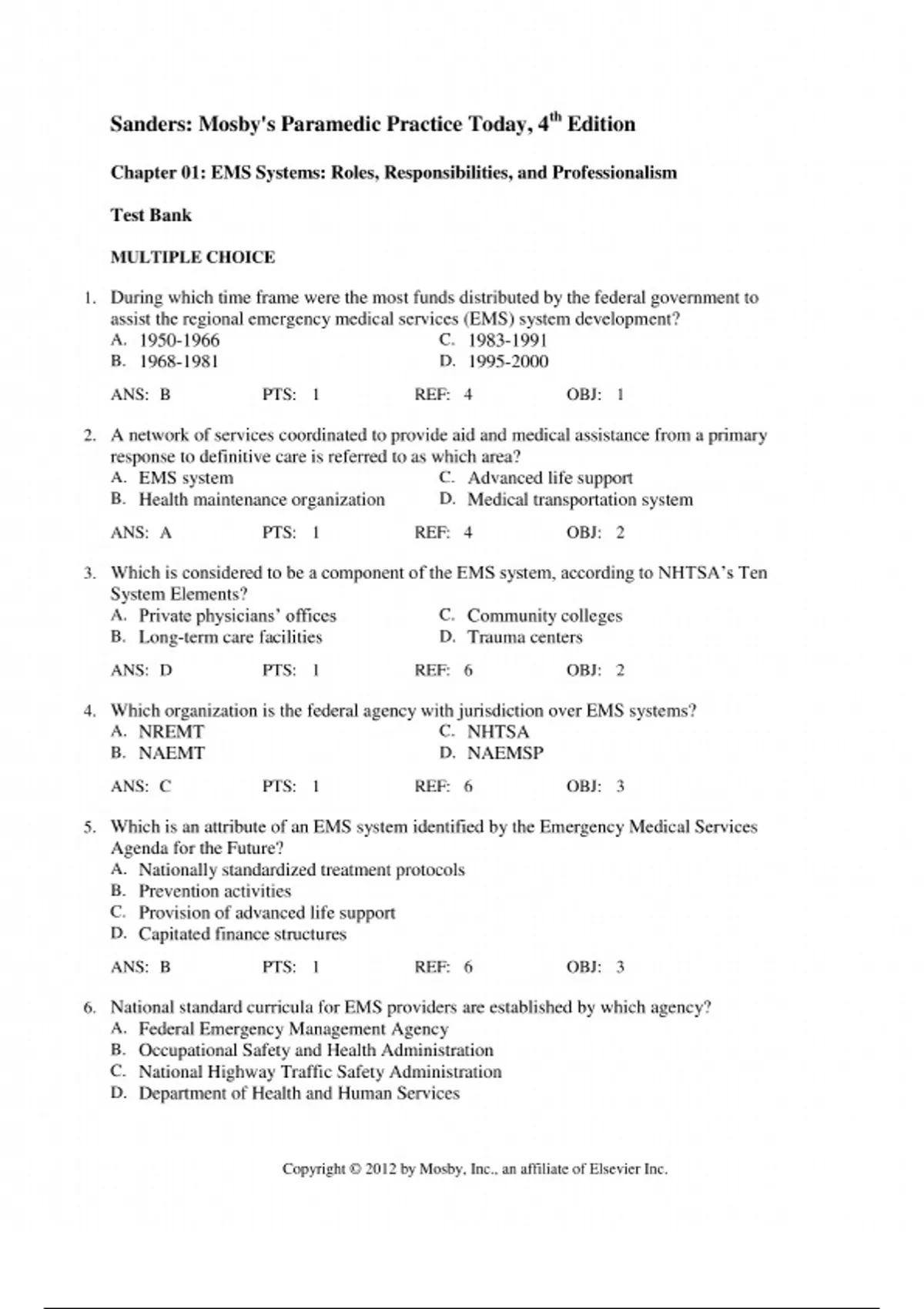 Test Bank - Mosbys Paramedic Textbook, 4th Edition Sanders | 9781284029543 | All Chapters Covered