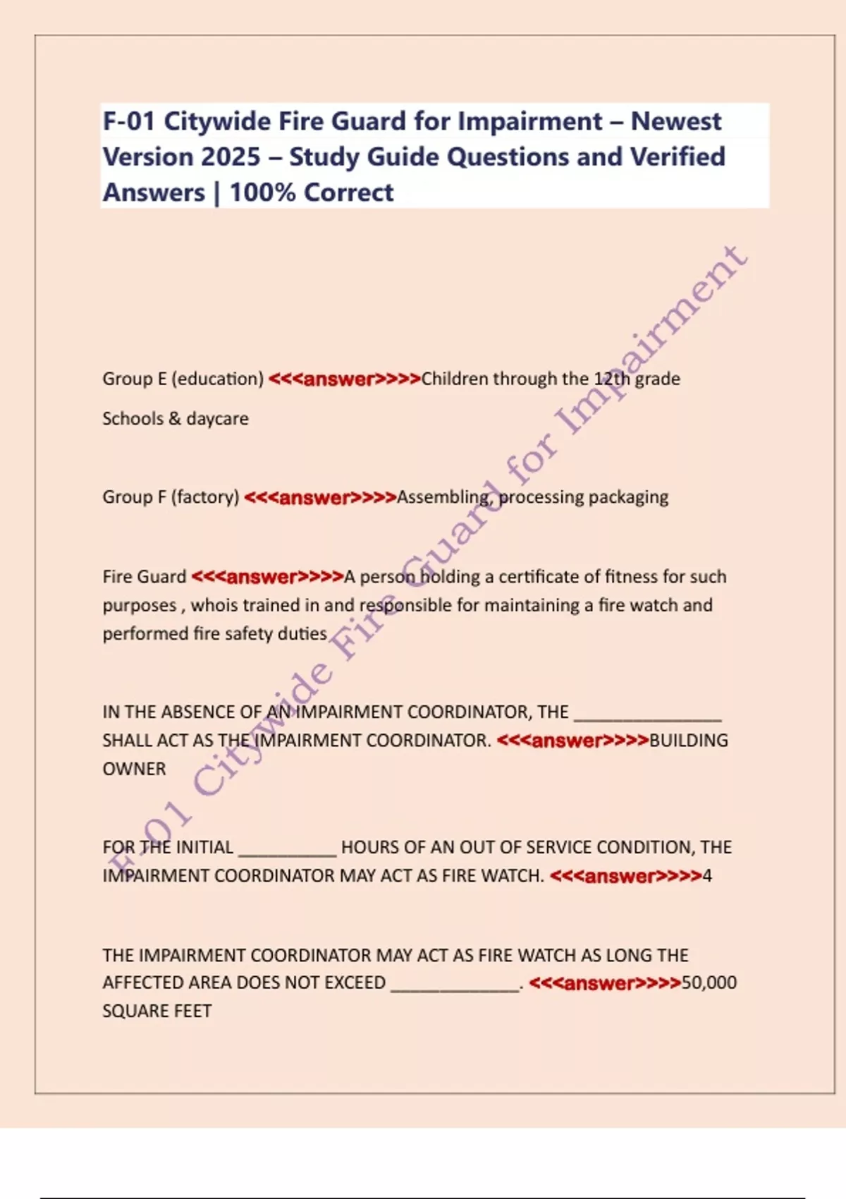 F-01 Citywide Fire Guard for Impairment – Newest Version 2025 – Study Guide Questions and Verified Answers | 100% Correct