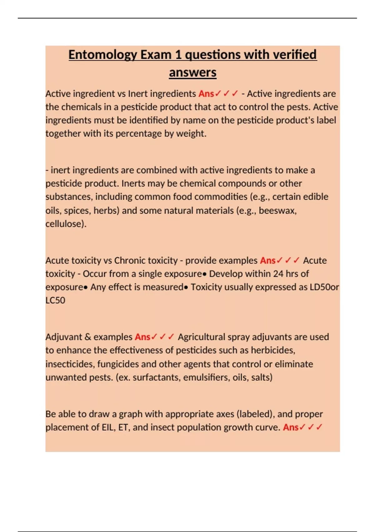 This document offers an in-depth and verified compilation of questions and answers from Exam 1 of an entomology course. It covers core concepts in insect biology, integrated pest management (IPM), toxicology (including LD₅₀), pesticide classifications, pest control strategies, metamorphosis types, arthropod characteristics, and sampling techniques. It also includes applied knowledge such as calculating degree days, understanding economic thresholds, and pesticide legislation. Perfect for agricultural science, biology, and entomology students preparing for midterm or certification exam