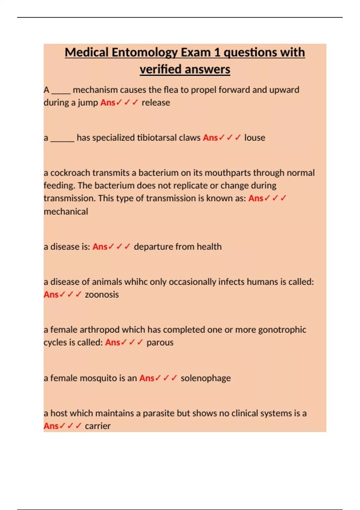 Medical Entomology Exam 1 – Verified Q&A | Parasites, Vectors & Arthropod-Borne Diseases