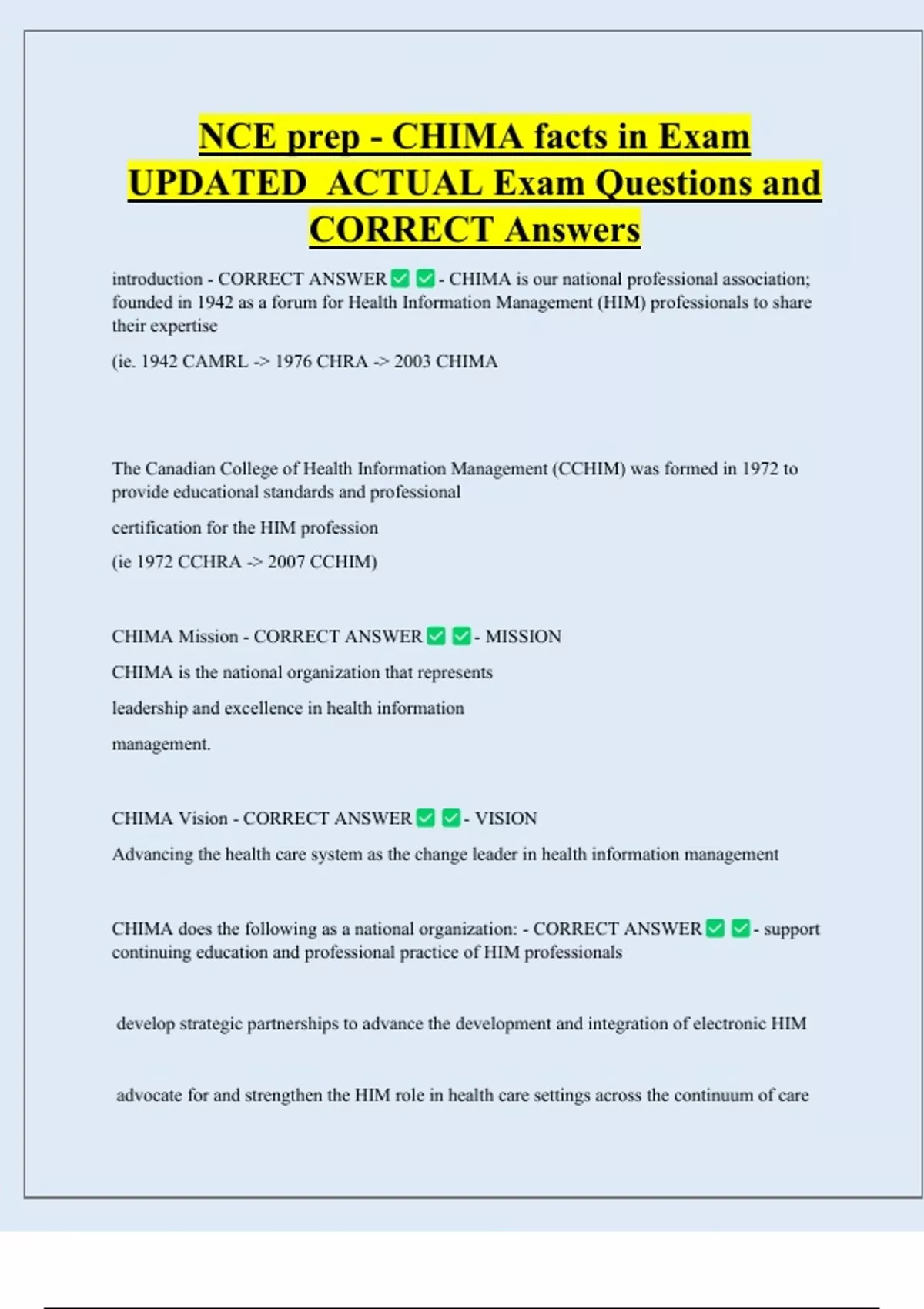 NCE prep - CHIMA facts in Exam UPDATED ACTUAL Exam Questions and CORRECT Answers introduction - CORRECT ANSWER - CHIMA is our national professional association; founded in 1942 as a forum for Health Information Management (HIM) professionals to share their expertise (ie. 1942 CAMRL -> 1976 CHRA -> 2003 CHIMA The Canadian College of Health Information Management (CCHIM) was formed in 1972 to provide educational standards and professiona
