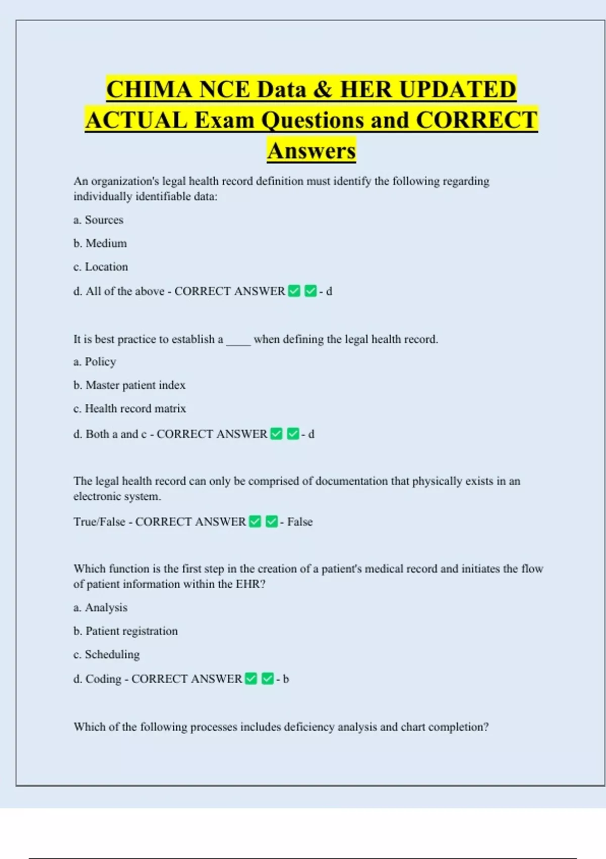 CHIMA NCE Data & HER UPDATED ACTUAL Exam Questions and CORRECT Answers
