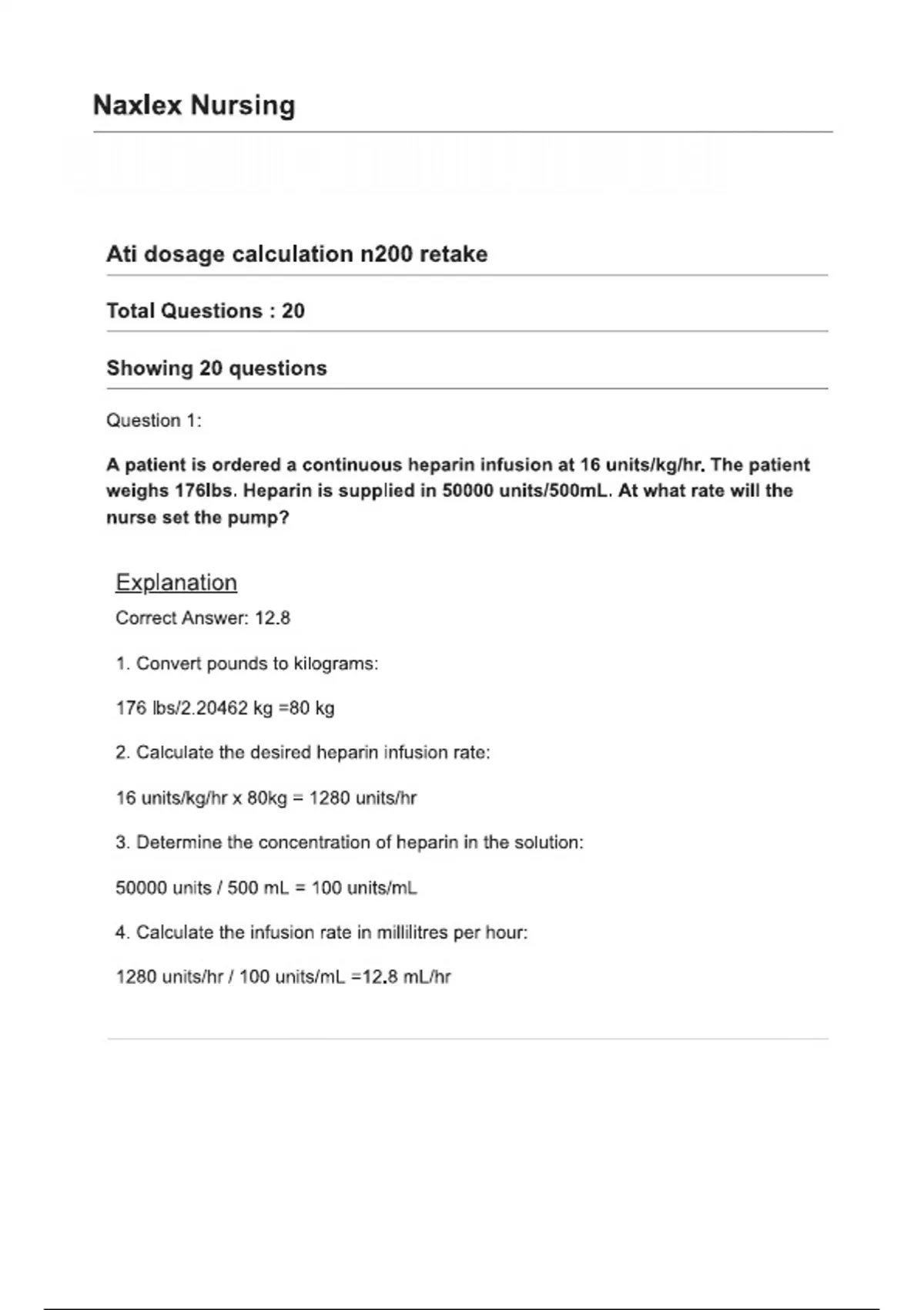 ATI N200 Dosage Calculation exam (20 Questions) for Retake questions with Verified detailed answers (RATED A+)