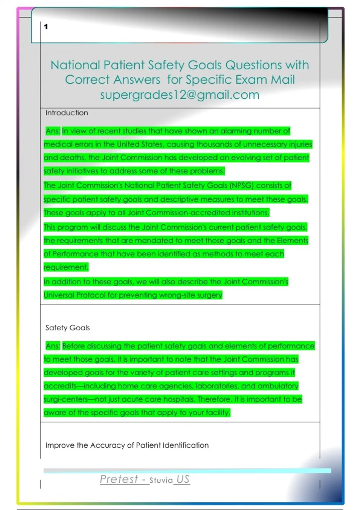 National Patient Safety Goals Questions with Correct Answers for Specific Exam Mail supergrades12@gmail.com