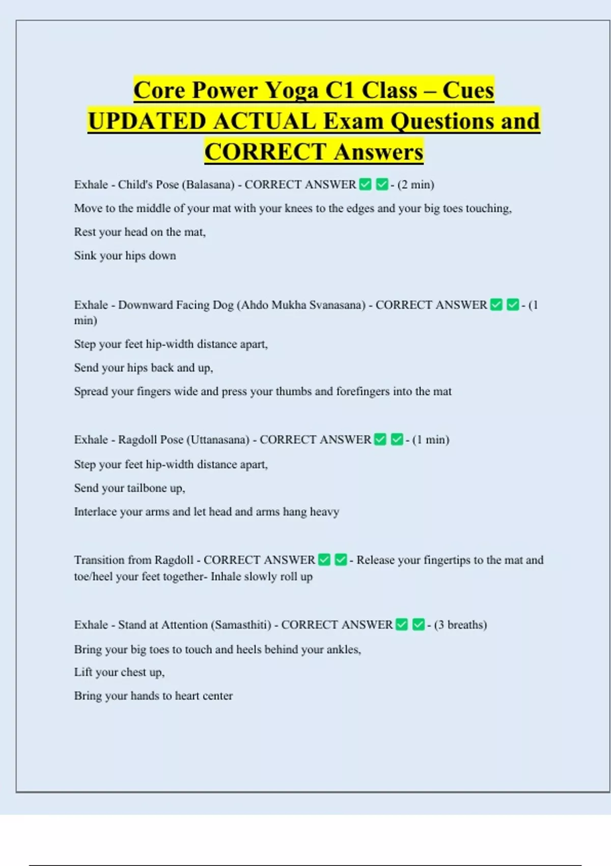 Core Power Yoga C1 Class – Cues UPDATED ACTUAL Exam Questions and CORRECT Answers Exhale - Child's Pose (Balasana) - CORRECT ANSWER - (2 min) Move to the middle of your mat with your knees to the edges and your big toes touching, Rest your head on the mat, Sink your hips down Exhale - Downward Facing Dog (Ahdo Mukha Svanasana) - CORRECT ANSWER min) Step your feet hip-width distance apart, Send your hips back and up, Spread your fingers wide and press your thumbs and forefingers into the mat Exhale - Ragdoll Pose (Uttanasana) - CORRECT ANSWER Step your feet hip-width distance apart, Send your tailbone up, Interlace your arms and let head and arms hang heavy Transition from Ragdoll - CORRECT ANSWER - (1 min) - (
