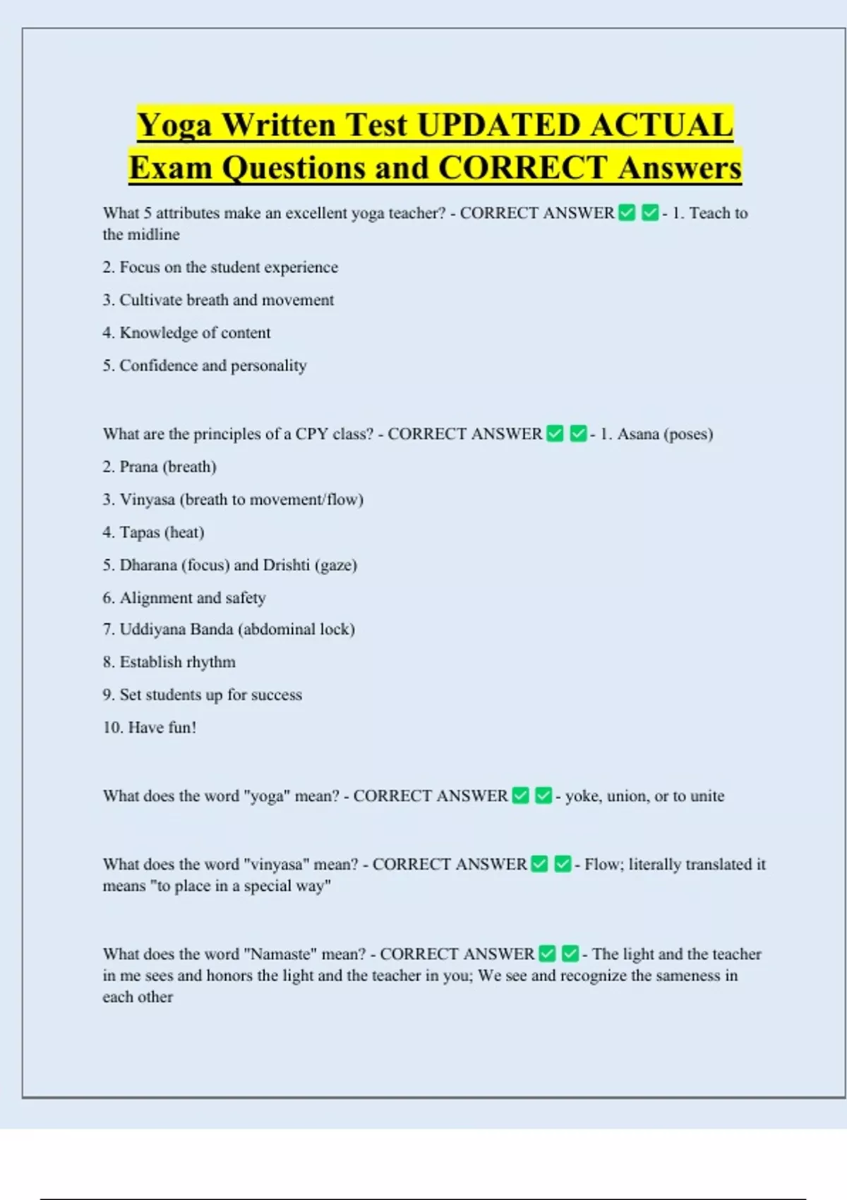 Yoga Written Test UPDATED ACTUAL Exam Questions and CORRECT Answers What 5 attributes make an excellent yoga teacher? - CORRECT ANSWER the midline 2. Focus on the student experience 3. Cultivate breath and movement 4. Knowledge of content 5. Confidence and personality What are the principles of a CPY class? - CORRECT ANSWER - 1. Teach to - 1. Asana (pose