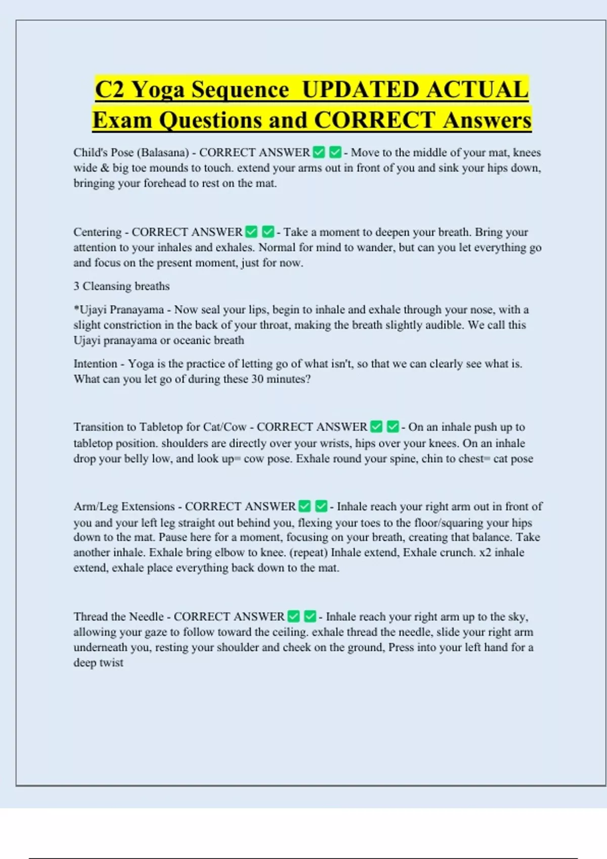 C2 Yoga Sequence UPDATED ACTUAL Exam Questions and CORRECT Answers Child's Pose (Balasana) - CORRECT ANSWER - Move to the middle of your mat, knees wide & big toe mounds to touch. extend your arms out in front of you and sink your hips down, bringing your forehead to rest on the mat. Centering - CORRECT ANSWER - Take a moment to deepen your breath. Bring your attention to your inhales and exhales. Normal for mind to wander, but can you let everything go and focus on the present moment, just for now. 3 Cleansing breaths *Ujayi Pranayama - Now seal your lips, begin to inhale and exhale through your nose, with a slight constriction in the back of your throat, making the breath slightly audible. We call th