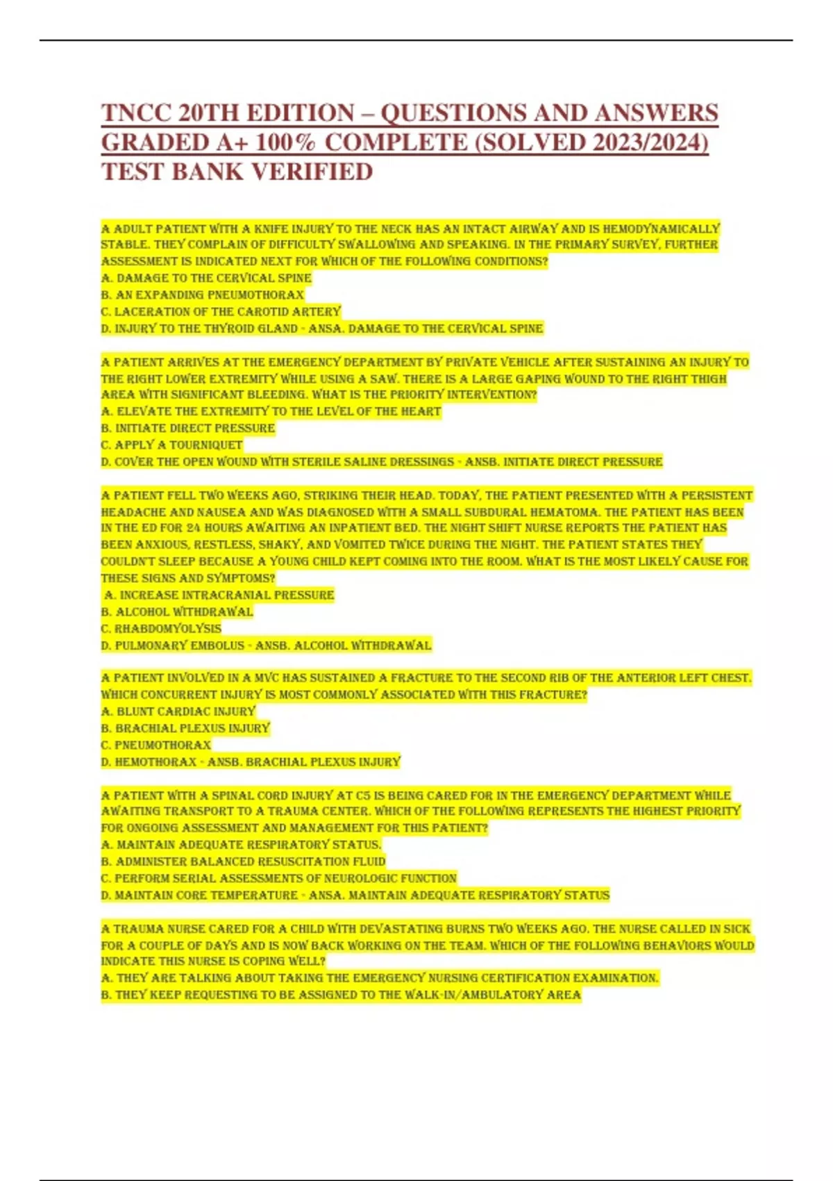 ,TNCC 20TH EDITION – QUESTIONS AND ANSWERS