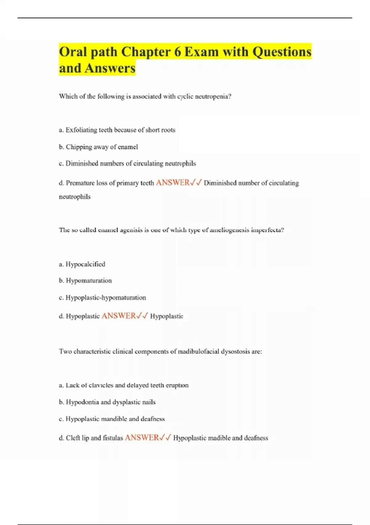 Oral path Chapter 6 Exam with Questions and Answers Which of the following is associated with cyclic neutropenia? a. Exfoliating teeth because of short roots b. Chipping away of enamel c. Diminished numbers of circulating neutrophils d. Premature loss of primary teeth ANSWER Diminished number of circulating neutrophils The so called enamel agenisis is one of which type of ameliogenesis imperfecta? a. Hypocalcified b. Hypomaturation c. Hypoplastic-hypomaturation d. Hypoplastic ANSWER Hypoplastic Two characteristic clinical components of madibulofacial dysostosis are: a. Lack of clavicles and delayed teeth eruption b. Hypodontia and dysplastic nails c. Hypoplastic mandible and deafness d. Cleft lip and fistulas ANSWER Hypoplastic madible and deafness