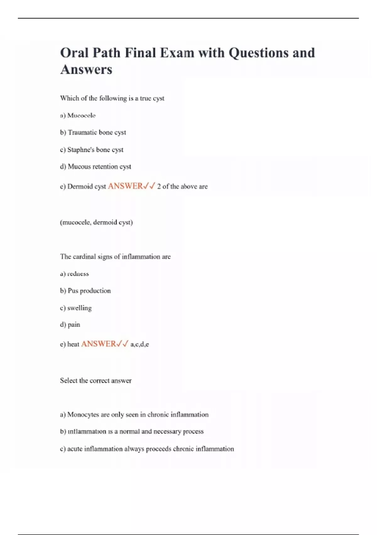 Oral Path Final Exam with Questions and Answers Which of the following is a true cyst a) Mucocele b) Traumatic bone cyst c) Staphne's bone cyst d) Mucous retention cyst e) Dermoid cyst ANSWER 2 of the above are (mucocele, dermoid cyst) The cardinal signs of inflammation are a) redness b) Pus production c) swelling d) pain e) heat ANSWER a,c,d,e Select the correct answer a) Monocytes are only seen in chronic inflammation b) inflammation is a normal and necessary process c) acute inflammation always proceeds chronic inflammation