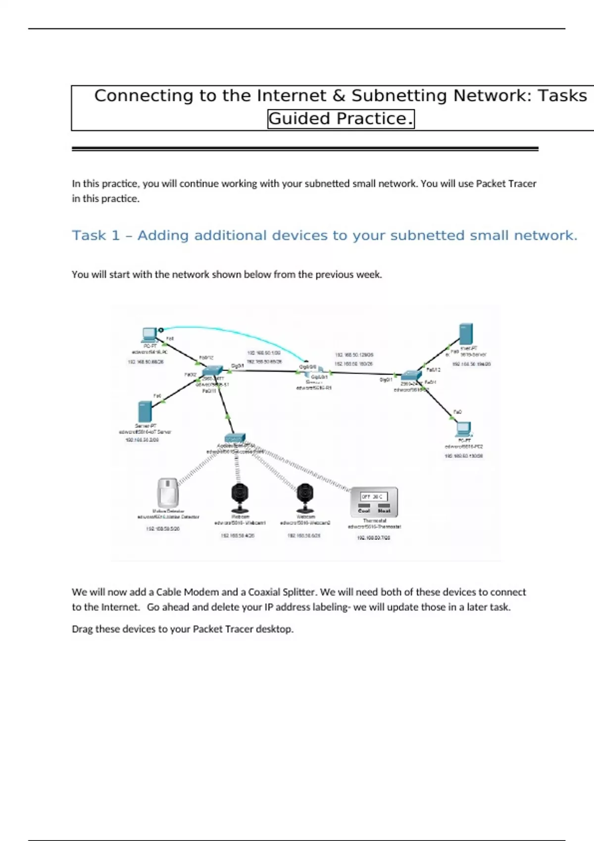 Task 1 – Adding additional devices to your subnetted small network.